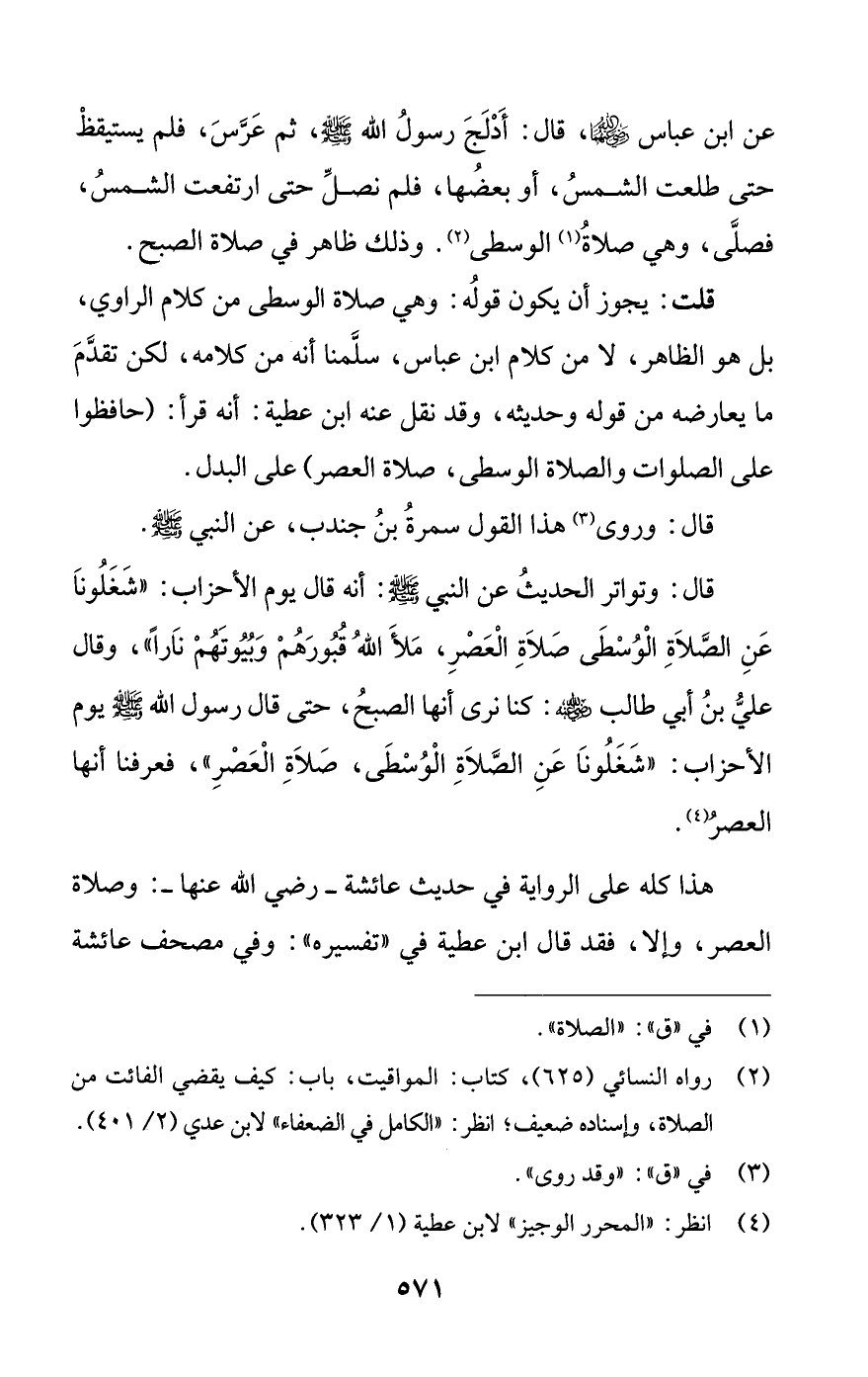 قال: وتواتر الحديث عن النبي - صلى الله عليه وسلم -: أنه قال يوم الأحزاب: «شغلونا عن الصلاة الوسطى صلاة العصر، ملأ الله قبورهم وبيوتهم نارا»، وقال علي بن أبي طالب -رضي الله عنه-: كنا نرى أنها الصبح، حتى قال رسول الله - صلى الله عليه وسلم - يوم
