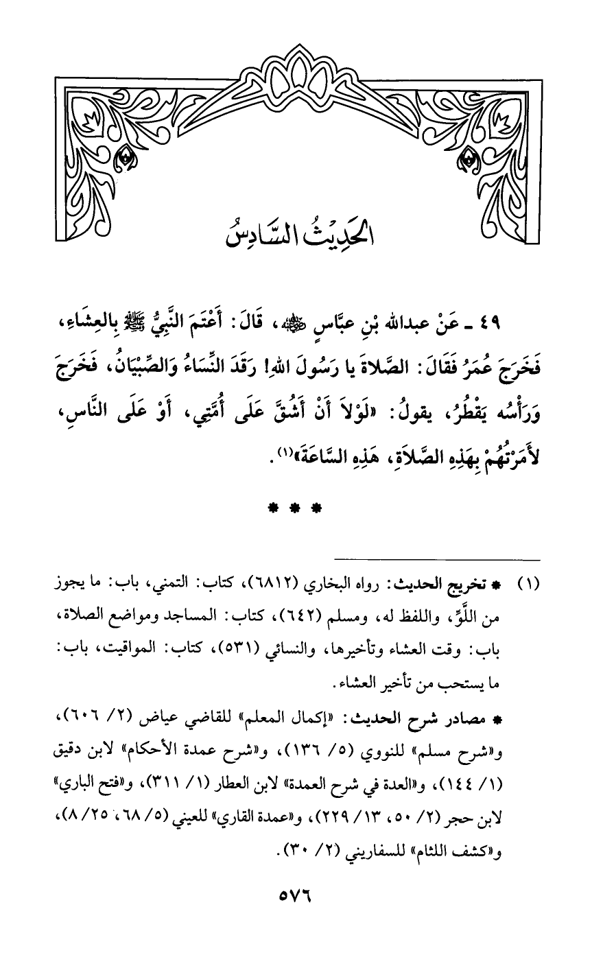 49 - عَنْ عَبْدِ اللَّهِ بْنِ عَبَّاسٍ -رضي الله عنهما-، قَالَ: أَعْتَمَ النَّبِيُّ - صلى الله عليه وسلم - بِالْعِشَاءِ، فَخَرَجَ عُمَرُ فَقَالَ: الصَّلاةُ يَا رَسُولَ اللَّهِ! رَقَدَ النِّسَاءُ وَالصِّبْيَانُ، فَخَرَجَ وَرَأْسُهُ يَقْطُرُ، يَقُولُ: «لَوْلا أَنْ أَشُقَّ عَلَى أُمَّتِي، أَوْ عَلَى النَّاسِ، لأَمَرْتُهُمْ بِهَذِهِ الصَّلاةِ، هَذِهِ السَّاعَةِ» (¬1).