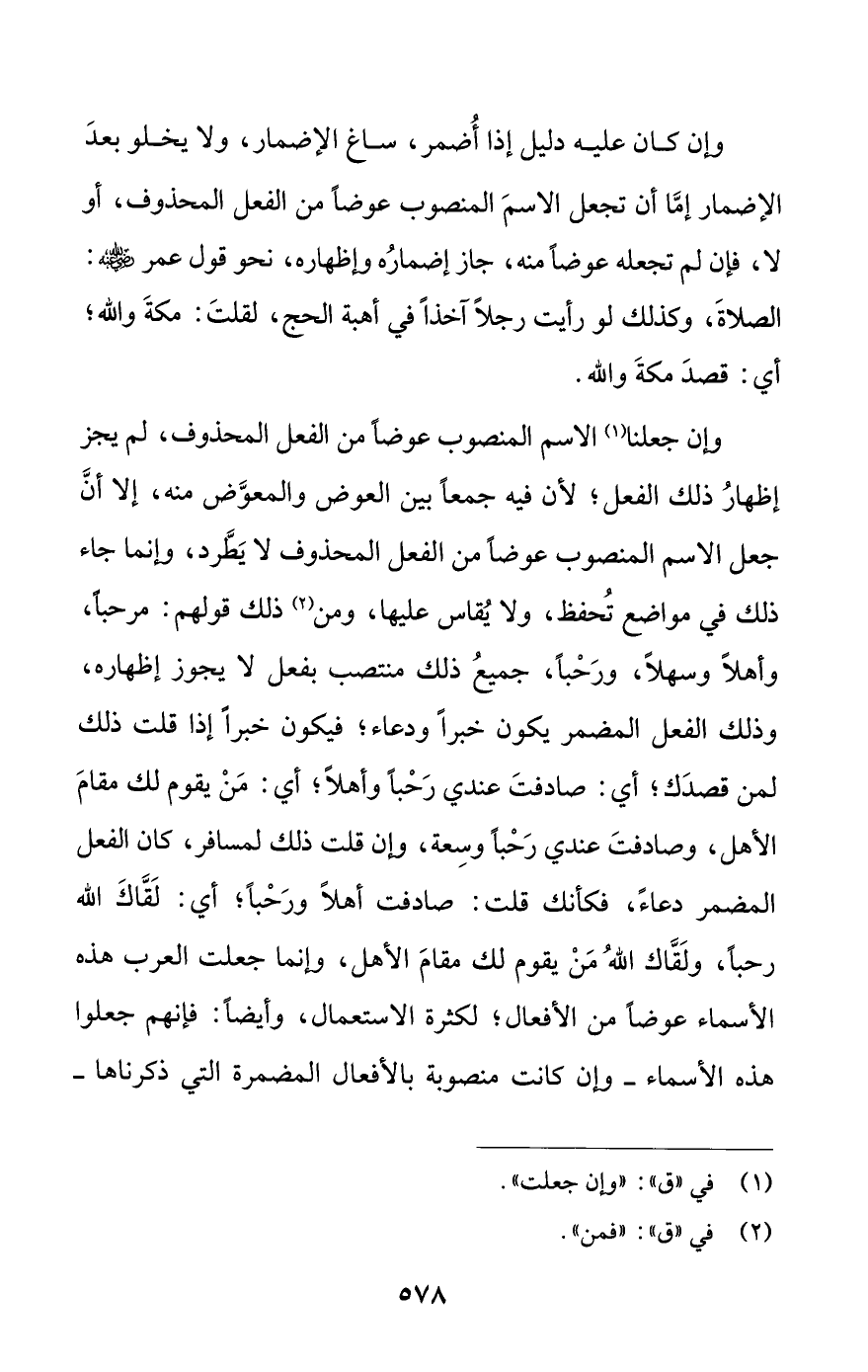 وإن كان عليه دليل إذا أضمر، ساغ الإضمار، ولا يخلو بعد الإضمار إما أن تجعل الاسم المنصوب عوضا من الفعل المحذوف، أو لا، فإن لم تجعله عوضا منه، جاز إضماره وإظهاره، نحو قول عمر -رضي الله عنه-: الصلاةَ، وكذلك لو رأيت رجلاً آخذًا في أهبة الحج، لقلت: مكةَ والله؛ أي: قصد مكةَ والله.