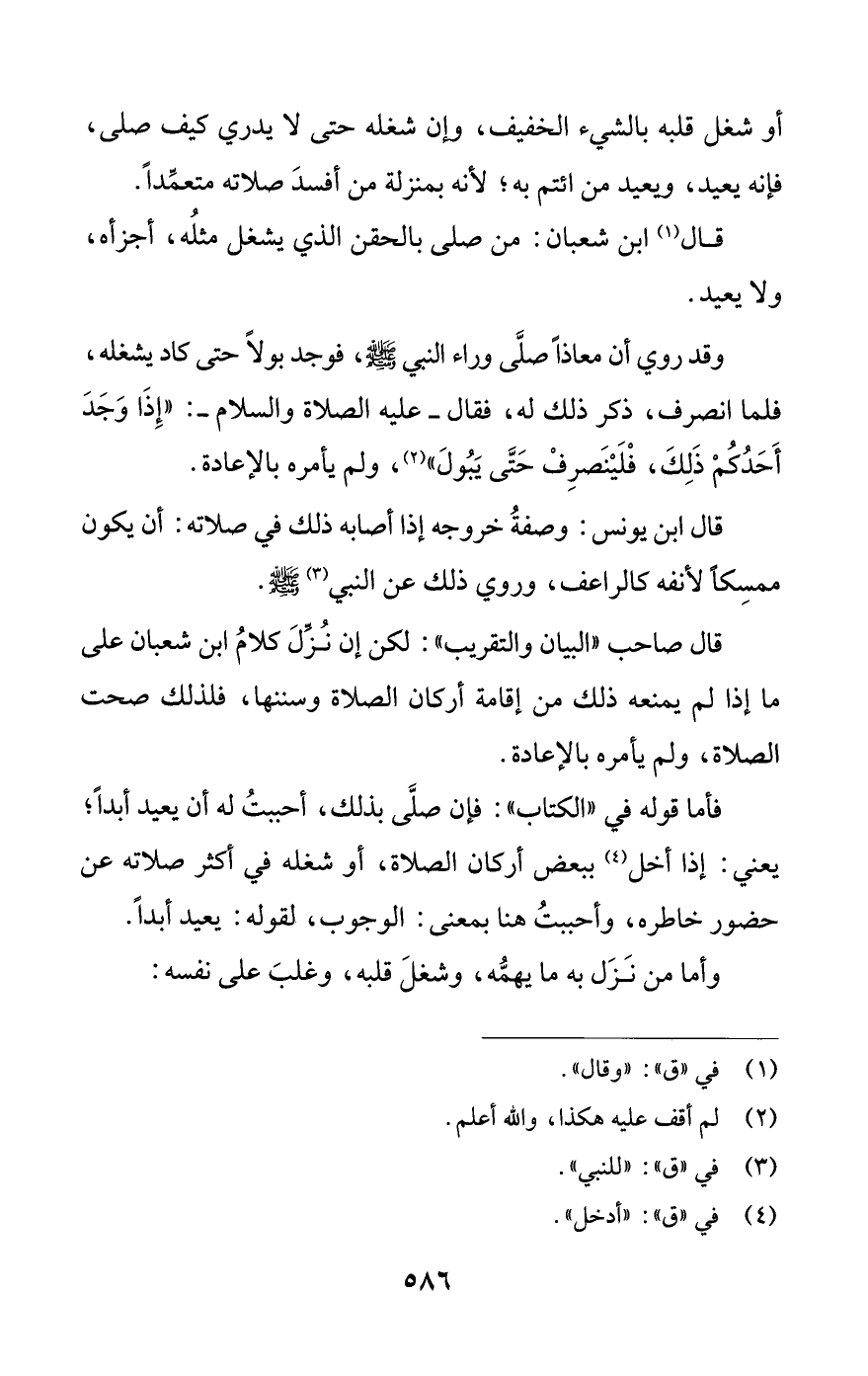 قال صاحب «البيان والتقريب»: لكن إن نزل كلام ابن شعبان على ما إذا لم يمنعه ذلك من إقامة أركان الصلاة وسننها، فلذلك صحت الصلاة، ولم يأمره بالإعادة.