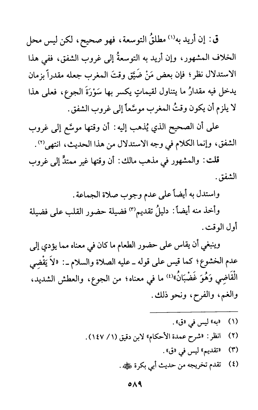 ق: إن أريد به (¬1) مطلق التوسعة، فهو صحيح، لكن ليس محل الخلاف المشهور، وإن أريد به التوسعة إلى غروب الشفق، ففي هذا الاستدلال نظر؛ فإن بعض من ضيق وقت المغرب جعله مقدرا بزمان يدخل فيه مقدار ما يتناول لقيمات يكسر بها سورة الجوع، فعلى هذا لا يلزم أن يكون وقت المغرب موسعا إلى غروب الشفق.