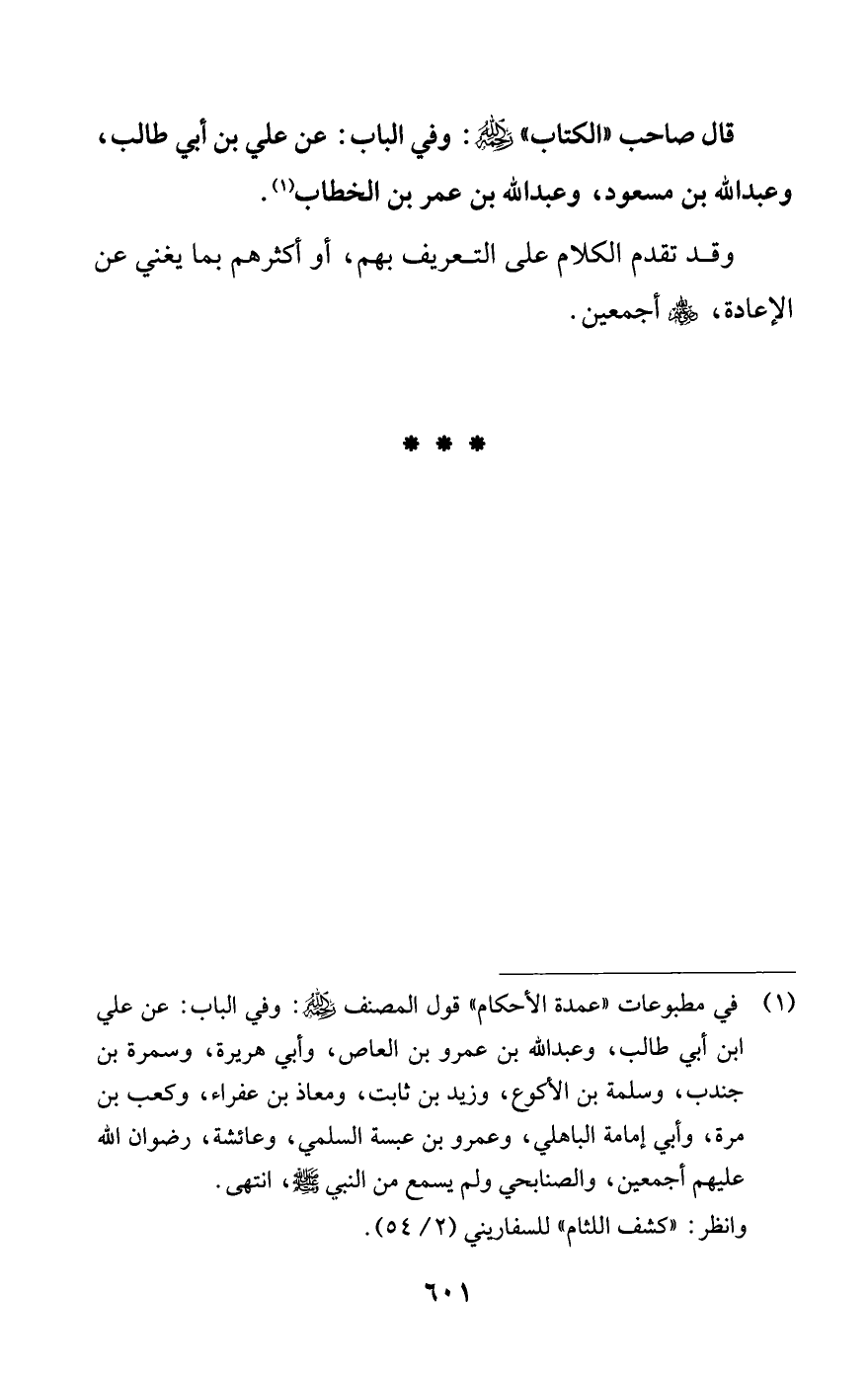 (¬1) في مطبوعات «عمدة الأحكام» قول المصنف - رحمه الله -: وفي البابِ: عنْ عليِّ بنِ أَبي طالبٍ، وعبدِ اللهِ بنِ عمرِو بنِ العاصِ، وأَبي هريرةَ، وسَمُرَةَ بنِ جُندُبِ، وسَلَمَةَ بنِ الأَكوَعِ، وزيدِ بنِ ثابتٍ، ومعاذِ بنِ عفراء، وكعبِ بنِ مُرَّةَ، وأَبي أُمامةَ الباهليِّ، وعمرِو بنِ عبسةَ السُلَميِّ، وعائشةَ، رِضْوَانُ الله عليهم أجمعين، والصَّنابحيِّ ولم يسمعْ منَ النبيِّ - صلى الله عليه وسلم، انتهى -.