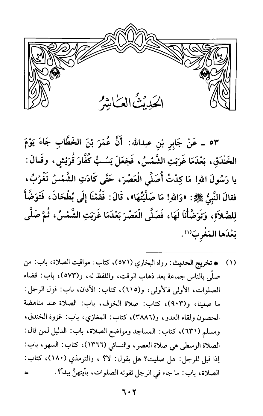 53 - عَنْ جَابِرِ بْنِ عَبْدِ اللَّهِ: أَنَّ عُمَرَ بْنَ الْخَطَّابِ جَاءَ يَوْمَ الْخَنْدَقِ، بَعْدَ مَا غَرَبَتِ الشَّمْسُ، فَجَعَلَ يَسُبُّ كُفَّارَ قُرَيْشٍ , وَقَالَ: يَا رَسُولَ اللَّهِ! مَا كِدْتُ أُصَلِّي الْعَصْرَ، حَتَّى كَادَتِ الشَّمْسُ تَغْرُبُ، فَقَالَ النَّبِيُّ - صلى الله عليه وسلم -: «وَاَللَّهِ! مَا صَلَّيْتُهَا»، قَالَ: فَقُمْنَا إلَى بَطْحَانَ , فَتَوَضَّأَ لِلصَّلاةِ , وَتَوَضَّأْنَا لَهَا , فَصَلَّى الْعَصْرَ بَعْدَ مَا غَرَبَتْ الشَّمْسُ، ثُمَّ صَلَّى بَعْدَهَا الْمَغْرِبَ (¬1).