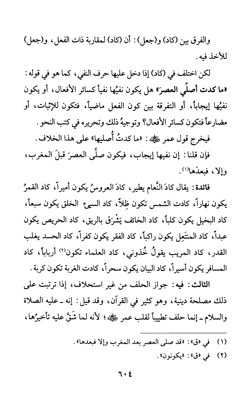 لكن اختلف في (كاد) إذا دخل عليها حرف النفي، كما هو في قوله: «ما كدت أصلي العصر» هل يكون نفيها نفيا كسائر الأفعال، أو يكون نفيها إيجابا، أو التفرقة بين كون الفعل ماضيا، فيكون للإثبات، أو مضارعا فتكون كسائر الأفعال؟