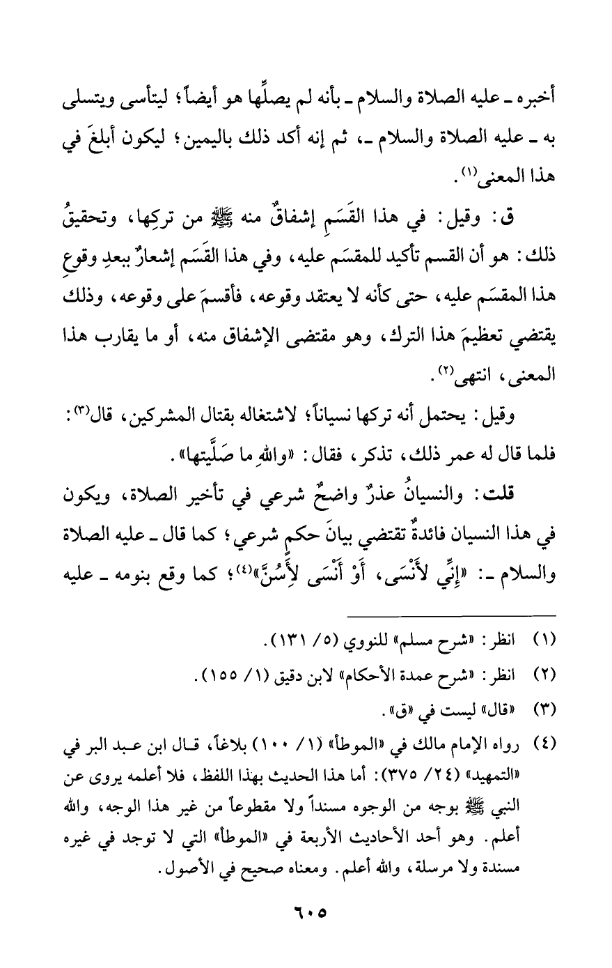 قلت: والنسيان عذر واضح شرعي في تأخير الصلاة، ويكون في هذا النسيان فائدة تقتضي بيان حكم شرعي؛ كما قال -عليه الصلاة والسلام-: «إني لأنسى أو أنسى لأسن»، (¬4)؛ كما وقع بنومه -عليه