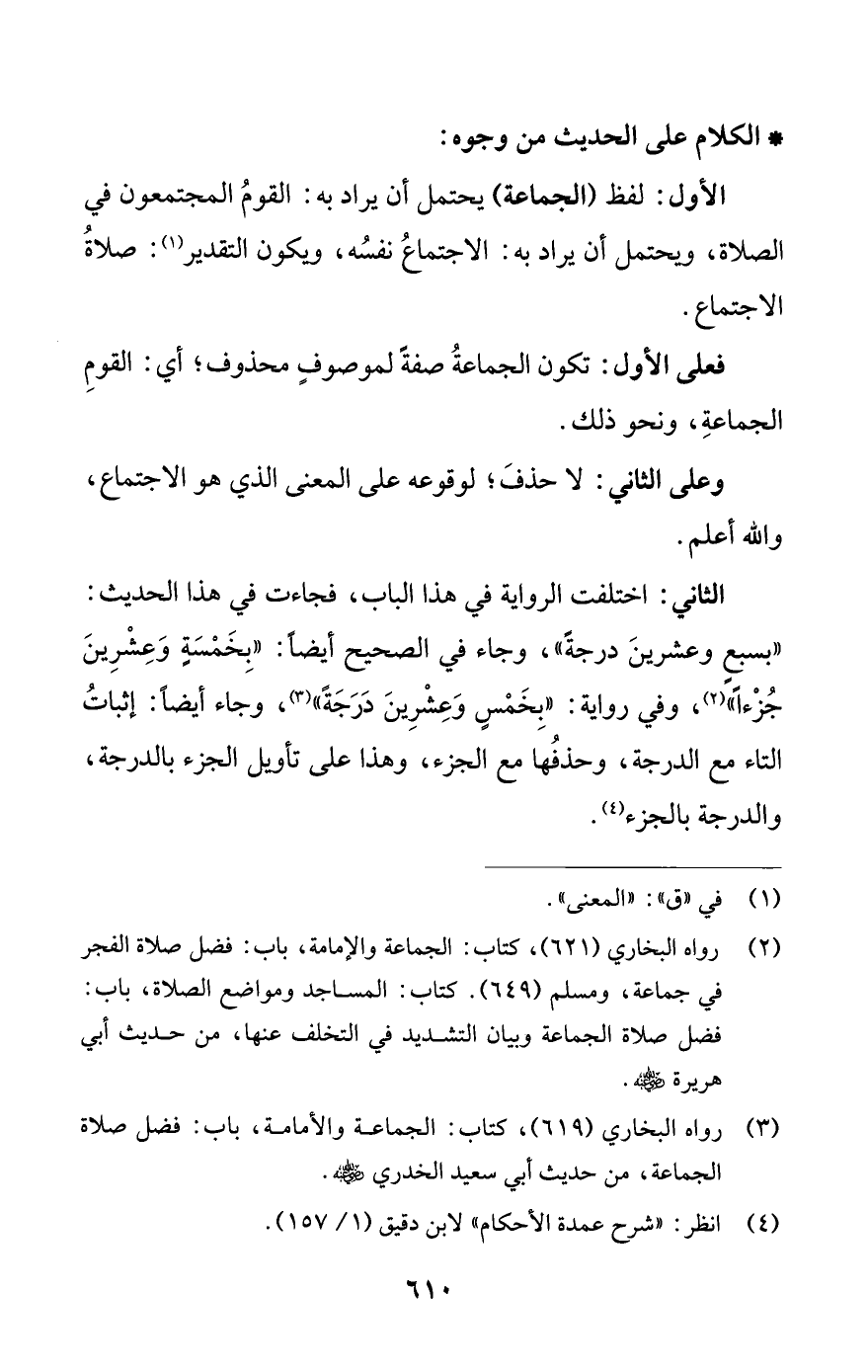 الأول: لفظ «الجماعة» يحتمل أن يراد به: القوم المجتمهعون في الصلاة، ويحتمل أن يراد به: الاجتماع نفسه، ويكون التقدير (¬1): صلاة الاجتماع.