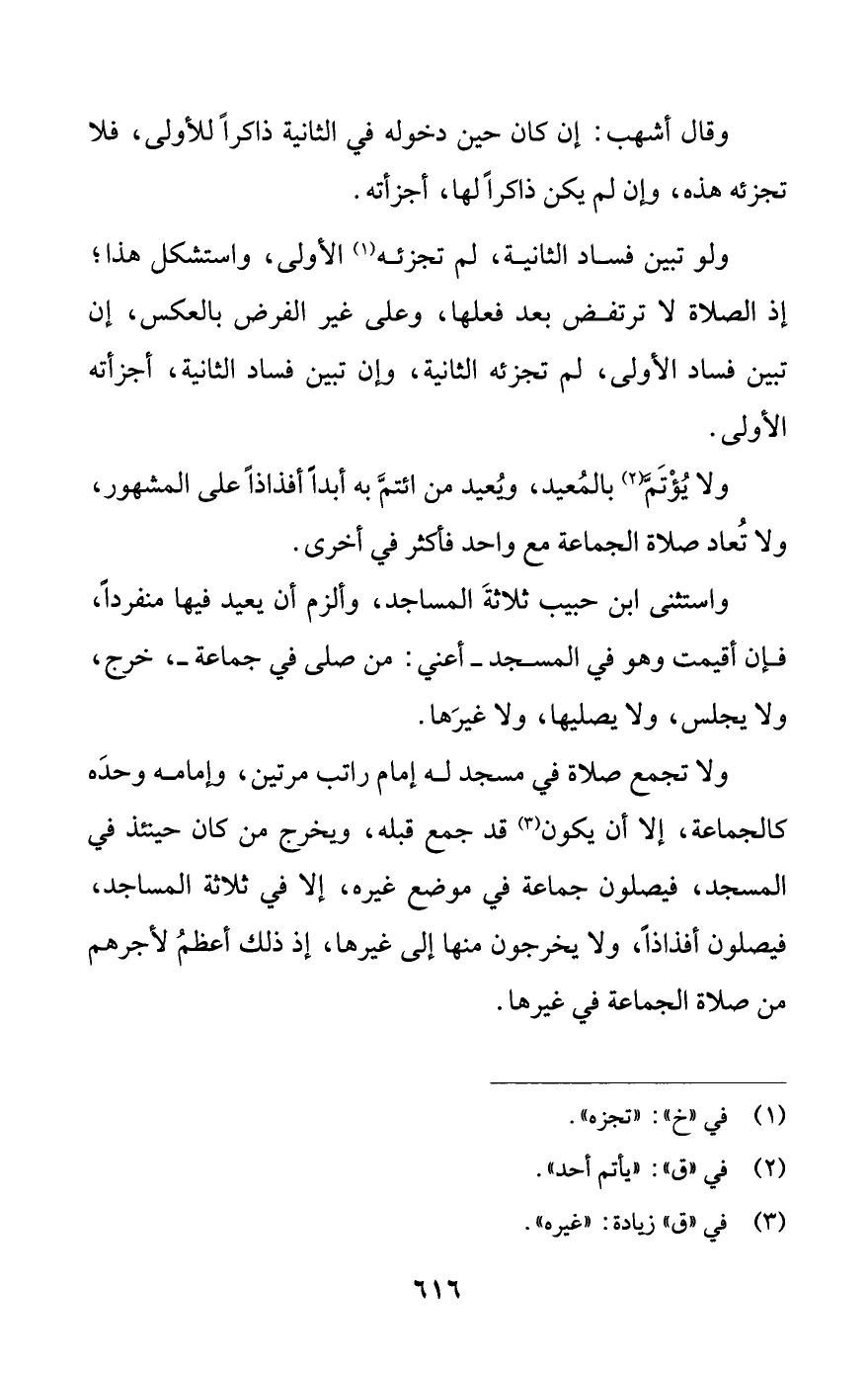 ولا تجمع صلاة في مسجد له إمام راتب مرتين، وإمامه وحده كالجماعة، إلا أن يكون (¬3) قد جنمع قبله، ويخرج من كان حينئذ في المسجد، فيصلون جماعة في موضع غيره، إلا في ثلاثة المساجد، فيصلون أفذاذا، ولا يخرجون منها إلى غيرها، إذ ذلك أعظم لأجرهم من صلاة الجماعة في غيرها