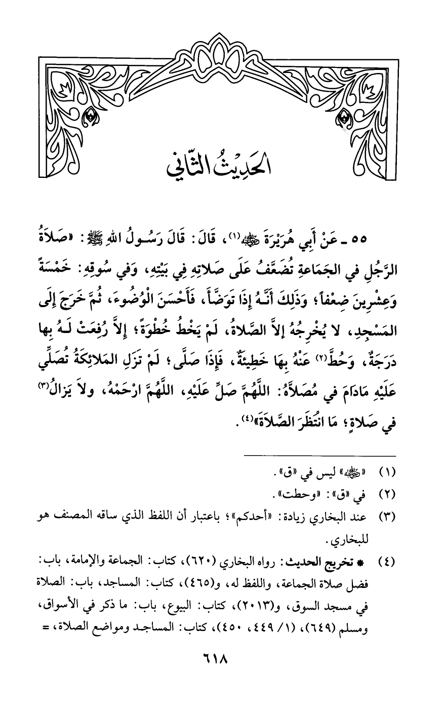 55 - عَنْ أَبِي هُرَيْرَةَ - رضي الله عنه - (¬1)، قَالَ: قَالَ رَسُولُ اللَّهِ - صلى الله عليه وسلم -: «صَلاةُ الرَّجُلِ فِي جَمَاعَةٍ تُضَعَّفُ عَلَى صَلاتِهِ فِي بَيْتِهِ، وَفِي سُوقِهِ: خَمْسةً وَعِشْرِينَ ضِعْفاً؛ وَذَلِكَ أَنَّهُ إذَا تَوَضَّأَ , فَأَحْسَنَ الْوُضُوءَ، ثُمَّ خَرَجَ إلَى الْمَسْجِدِ، لا يُخْرِجُهُ إلا الصَّلاةُ، لَمْ يَخْطُ خُطْوَةً؛ إلا رُفِعَتْ لَهُ بِهَا دَرَجَةٌ , وَحُطَّ (¬2) (عَنْهُ بِهَا خَطِيئَةٌ، فَإِذَا صَلَّى؛ لَمْ تَزَلِ الْمَلائِكَةُ تُصَلِّي عَلَيْهِ مَا دَامَ فِي مُصَلاهُ: اللَّهُمَّ صَلِّ عَلَيْهِ , اللَّهُمَّ ارْحَمْهُ , وَلا يَزَالُ (¬3) فِي صَلاةٍ؛ مَا انْتَظَرَ الصَّلاةَ» (¬4).