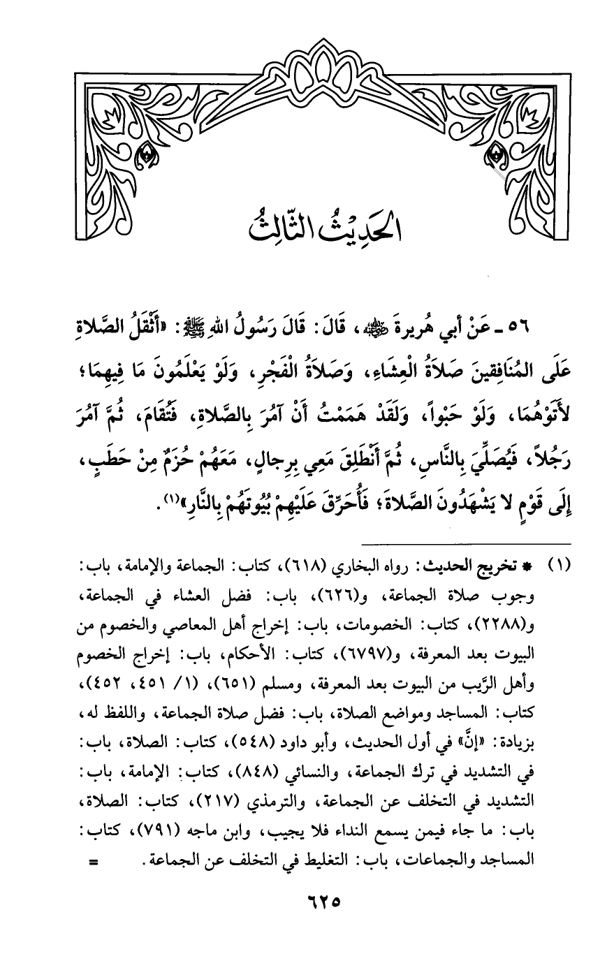 56 - عَنْ أَبِي هُرَيْرَةَ - رضي الله عنه -، قَالَ: قَالَ رَسُولُ اللَّهِ - صلى الله عليه وسلم -: «أَثْقَلُ الصَّلاةِ عَلَى الْمُنَافِقِينَ صَلاةُ الْعِشَاءِ , وَصَلاةُ الْفَجْرِ، وَلَوْ يَعْلَمُونَ مَا فِيهِمَا؛ لأَتَوْهُمَا وَلَوْ حَبْوًا، وَلَقَدْ هَمَمْتُ أَنْ آمُرَ بِالصَّلاةِ، فَتُقَامَ , ثُمَّ آمُرَ رَجُلاً، فَيُصَلِّيَ بِالنَّاسِ , ثُمَّ أَنْطَلِقَ مَعِي بِرِجَالٍ، مَعَهُمْ حُزَمٌ مِنْ حَطَبٍ، إلَى قَوْمٍ لا يَشْهَدُونَ الصَّلاةَ؛ فَأُحَرِّقَ عَلَيْهِمْ بُيُوتَهُمْ بِالنَّارِ» (¬1).