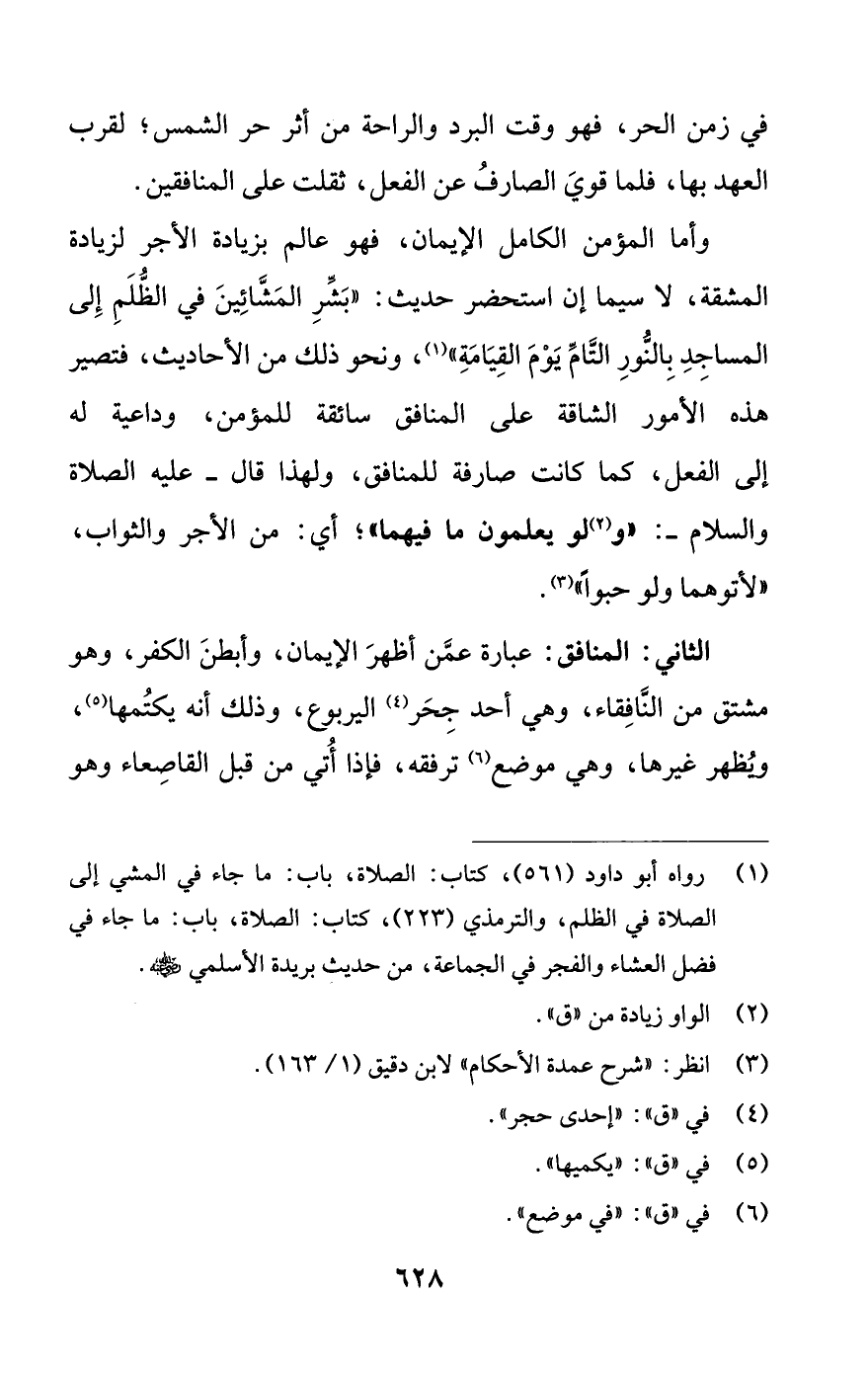 وأما المؤمن الكامل الإيمان، فهو عالم بزيادة الأجر لزيادة المشقة، لا سيما إن استحضر حديث: «بشر المشائين في الظلم إلى المساجد بالنور التام يوم القيامة» (¬1)، ونحو ذلك من الأحاديث، فتصير هذه الأمور الشاقة على المنافق سائقة للمؤمن، وداعية له إلى الفعل، كما كانت صارفة للمنافق، ولهذا قال -عليه الصلاة والسلام-: «و (¬2) لو يعلمون ما فيهما»؛ أي: من الأجر والثواب، «لأتوهما ولو حبوا» (¬3).