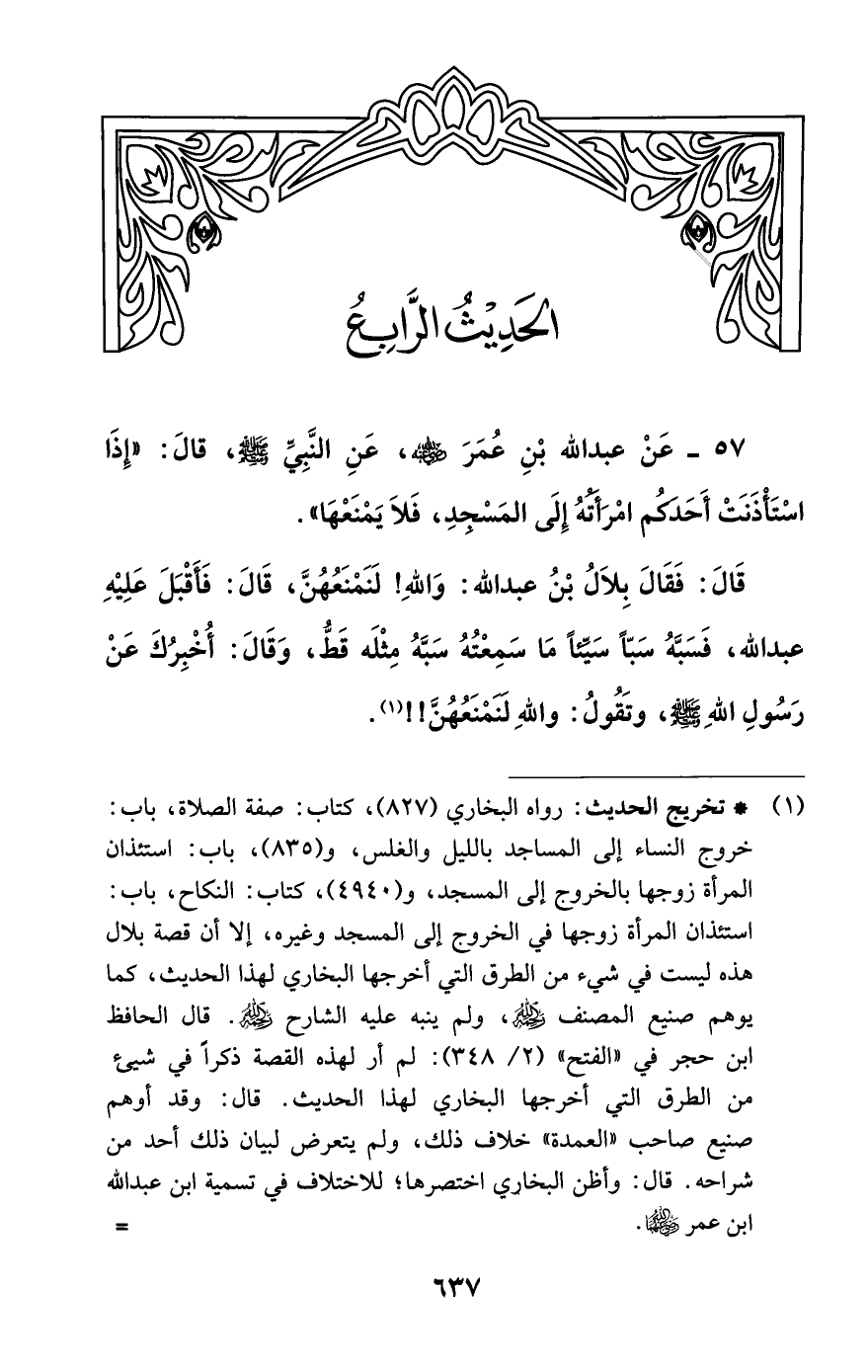 57 - عَنْ عَبْدِ اللَّهِ بْنِ عُمَرَ رضي الله عنه، عَنِ النَّبيِّ - صلى الله عليه وسلم - قَالَ: «إذَا اسْتَأْذَنَتْ أَحَدَكُمْ امْرَأَتُهُ إلَى الْمَسْجِدِ، فَلا يَمْنَعُهَا.