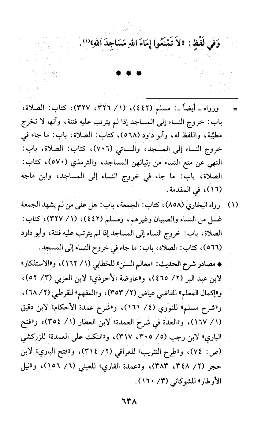 = ورواه أيضا: مسلم (442)، (1/ 326، 327)، كتاب: الصلاة، باب: خروج النساء إلى المساجد إذا لم يترتب عليه فتنة، وأنها لا تخرج مطيبة، واللفظ له، وأبو داود (568)، كتاب: الصلاة، باب: ما جاء في خروج النساء إلى المسجد، والنسائي (706)، كتاب: الصلاة، باب: النهي عن منع النساء من إتيانهن المساجد، والترمذي (570)، كتاب: الصلاة، باب: ما جاء في خروج النساء إلى المساجد، وابن ماجه (16)، في المقدمة.