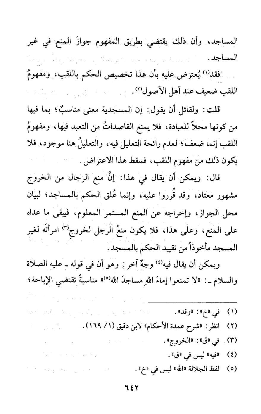 قلت: ولقائل أن يقول: إن المسجدية معنى مناسب؛ بمافيها من كونها محلا للعبادة، فلا يمنع القاصدات من التعبد فيها، ومفهوم اللقب إنما ضعف؛ لعدم رائحة التعليل فيه، والتعليل هنا موجود، فلا يكون ذالك من مفهوم اللقب، فسقط هذا الاعتراض.