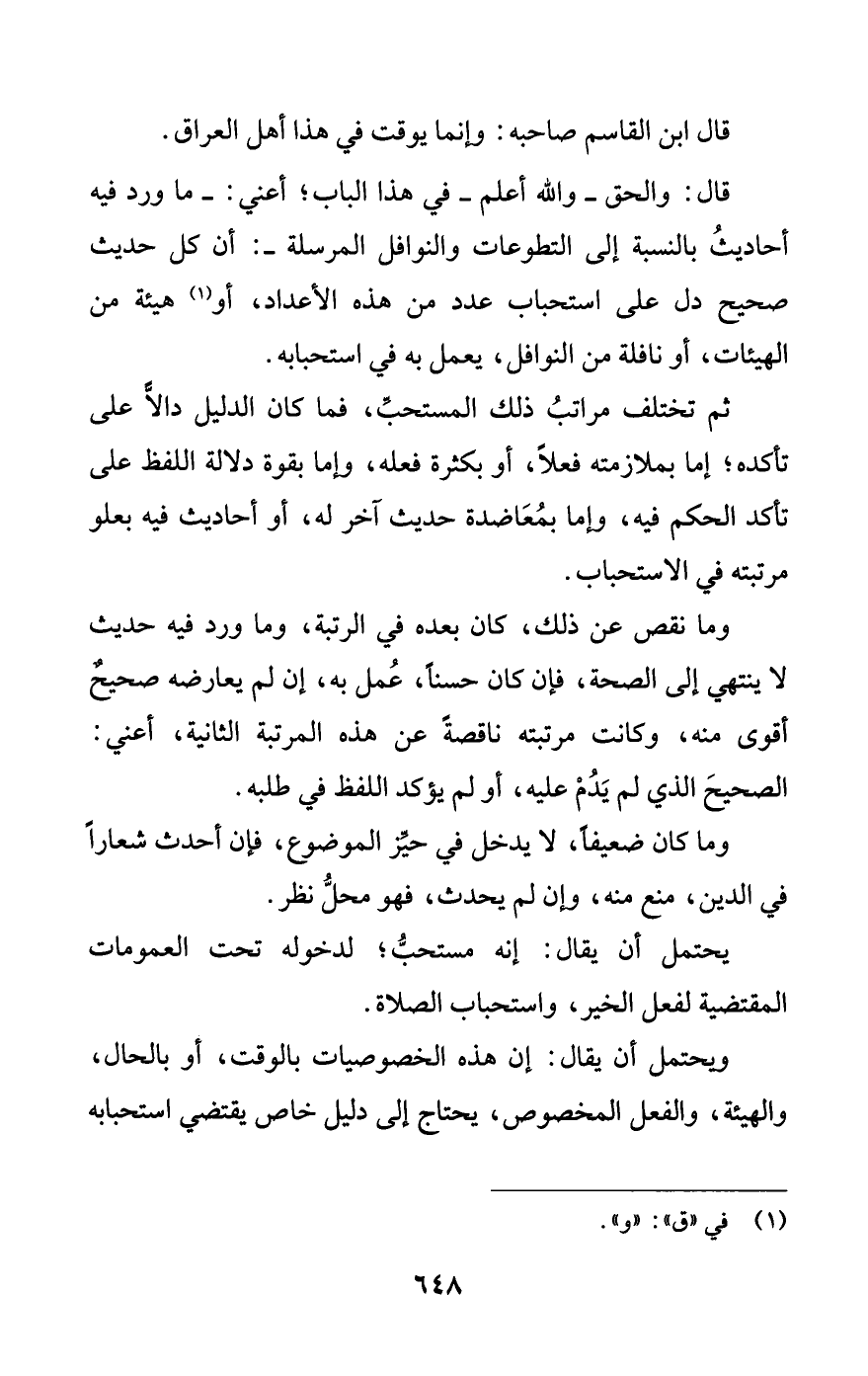 قال: والحق -والله أعلم- في هذا الباب؛ أعني: -ما ورد فيه أحاديث بالنسبة إلى التطوعات والنوافل المرسلة-: أن كل حديث صحيح دل على استحباب عدد من هذه الأعداد، أو (¬1) هيئة من الهيئات، أو نافلة من النوافل، يعمل به في استحبابه.