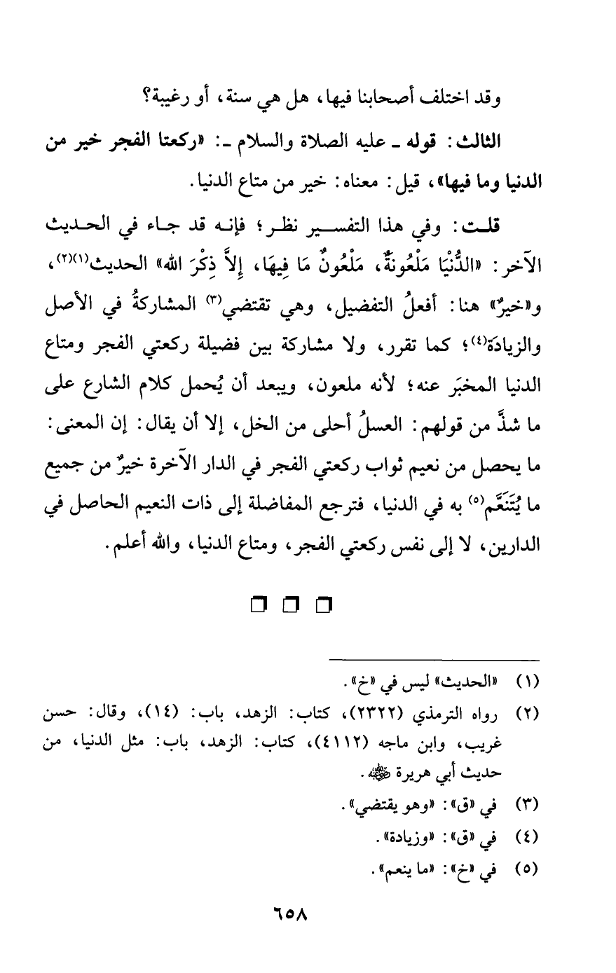 الثالث: قوله -عليه الصلاة والسلام-: «ركعتا الفجر خير من الدنيا وما فيها»، قيل: معناه: خير من متاع الدنيا.
