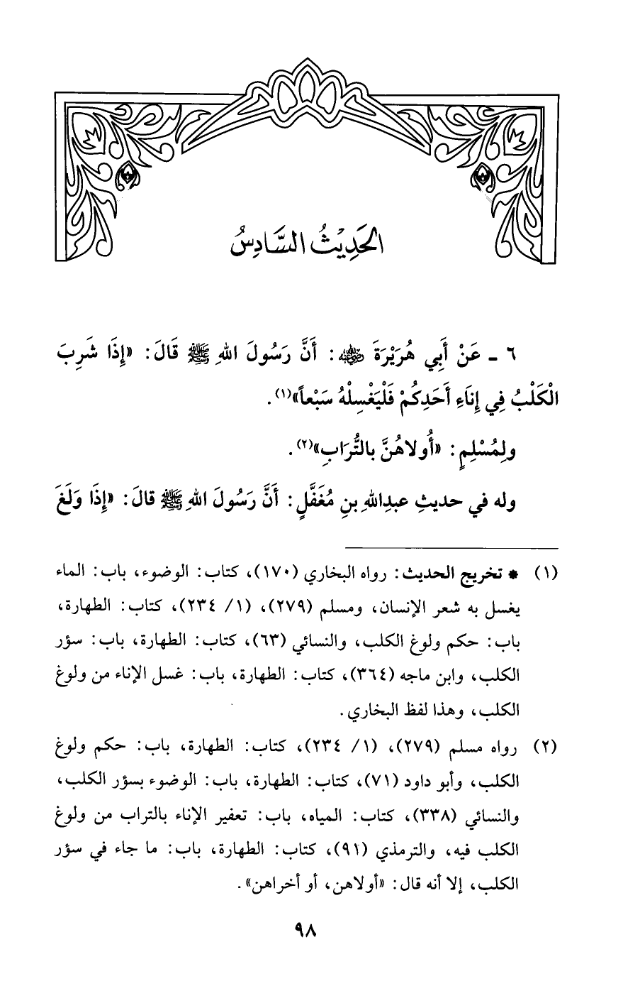 6 - عَنْ أَبِي هُرَيْرَةَ - رضي الله عنه -: أَنَّ رَسُولَ اللَّهِ - صلى الله عليه وسلم - قَالَ: «إذَا شَرِبَ الْكَلْبُ فِي إنَاءِ أَحَدِكُمْ فَلْيَغْسِلْهُ سَبْعاً» (¬1).