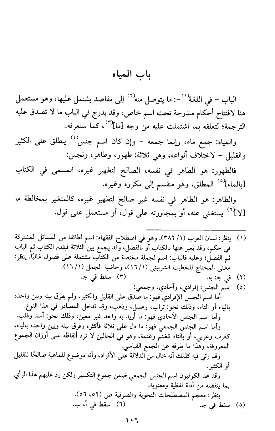 والمياه: جمع ماء, وإنما جمعه -وإن كان اسم جنس ينطلق على الكثير والقليل- لاختلاف أنواعه, وهي ثلاثة: طهور، وطاهر، ونجس: