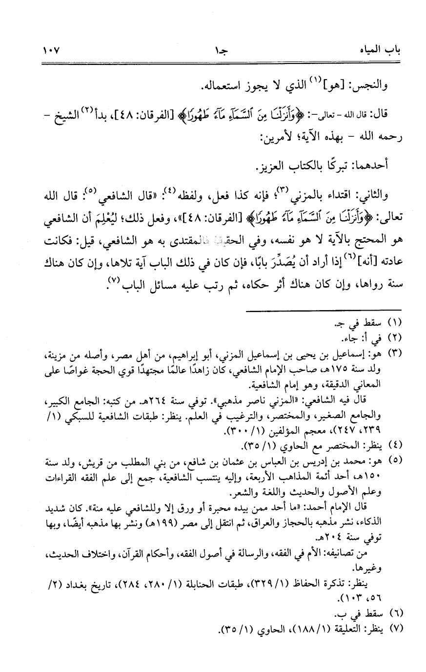 والثاني: اقتداء بالمزني؛ فإنه كذا فعل, ولفظه: "قال الشافعي: قال الله تعالى {وأنزلنا من السماء ماء طهورا} "، وفعل ذلك ليُعلِم أن الشافعي هو المحتج بالآية لا هو نفسه, وفي الحقيقة فالمقتدى به هو الشافعي, قيل: فكانت عادته أنه إذا أراد أن يصدر بابا، فإن كان في ذلك الباب آية تلاها, وإن كان هناك سنة رواها, وإن كان هناك أثر حكاه, ثم رتب عليه مسائل الباب.