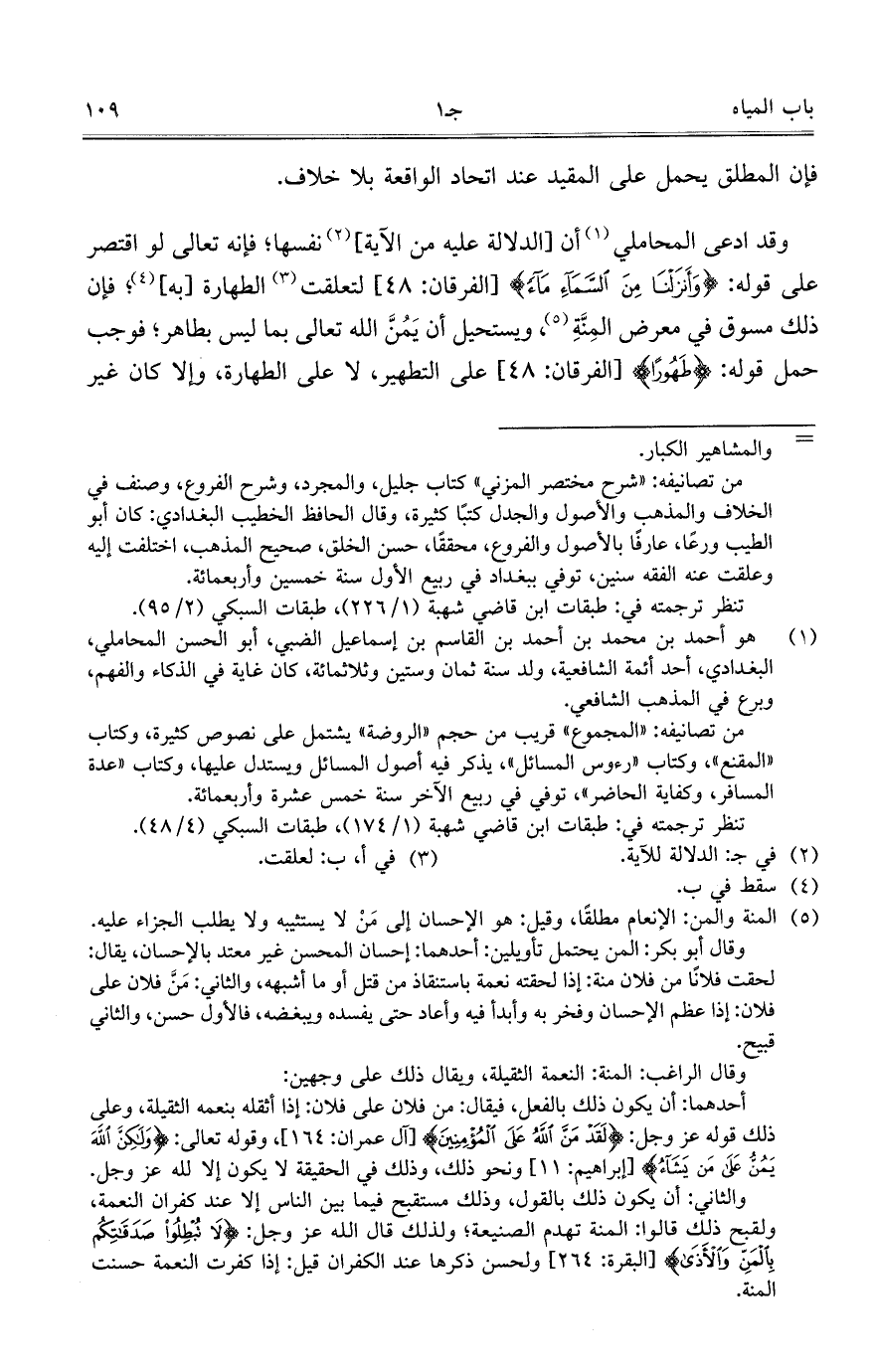 وقد ادعى المحاملي أن الدلالة عليه من الآية نفسها؛ فإنه تعالى لو اقتصر على قوله: {وأنزلنا من السماء ماء} لتعلقت الطهارة به, فإن ذلك مسوق في معرض المنة, ويستحيل أن يمن الله تعالى بما ليس بطاهر, فوجب حمل قوله: {طهورا} على التطهير، لا على الطهارة, وإلا كان غير