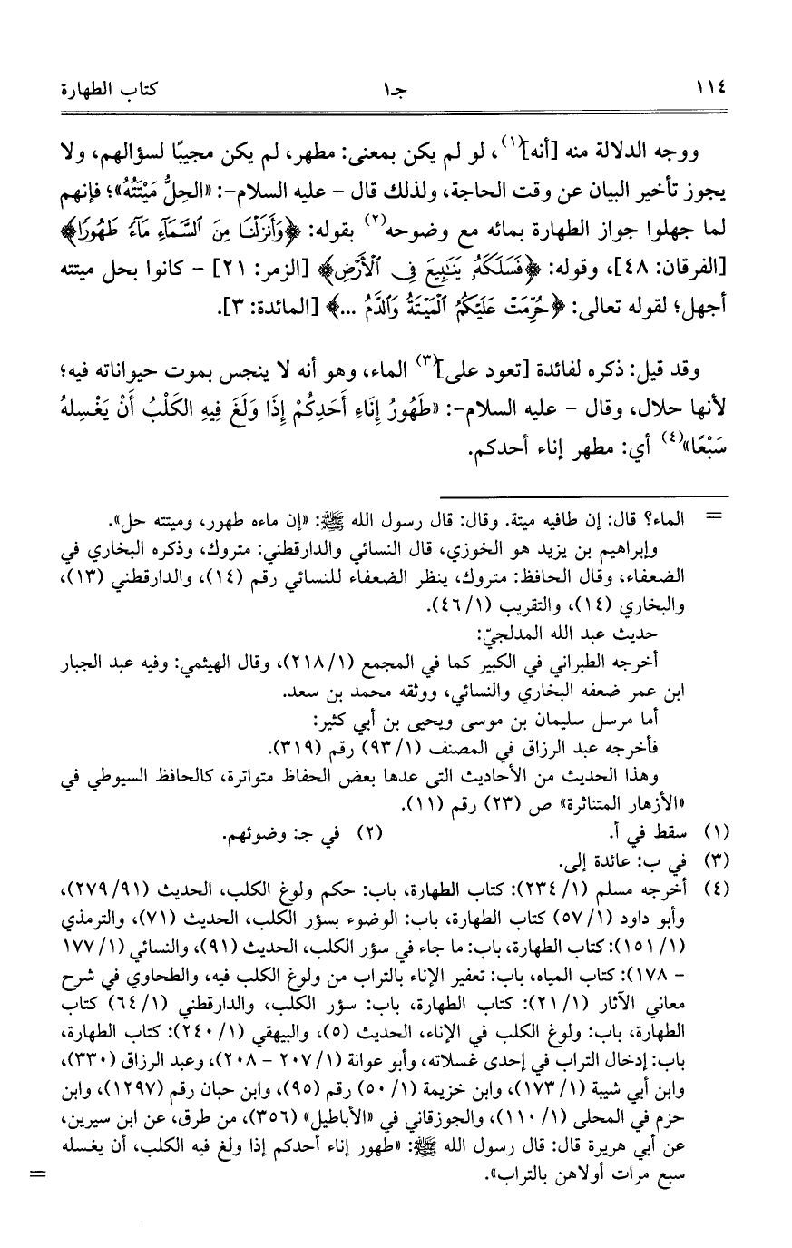 ووجه الدلالة منه أنه لو لم يكن بمعنى: مطهر, لم يكن مجيبا لسؤالهم, ولا يجوز تأخير البيان عن وقت الحاجة, ولذلك قال -عليه السلام-: (الحل ميتته)؛ فإنهم لما جهلوا جواز الطهارة بمائه مع وضوحه بقوله: {وأنزلنا من السماء ماء طهورا} وقوله: {فسلكه ينابيع في الأرض} - كانوا بحل ميتته أجهل؛ لقوله تعالى: {حرمت عليكم الميتة والدم ...}.