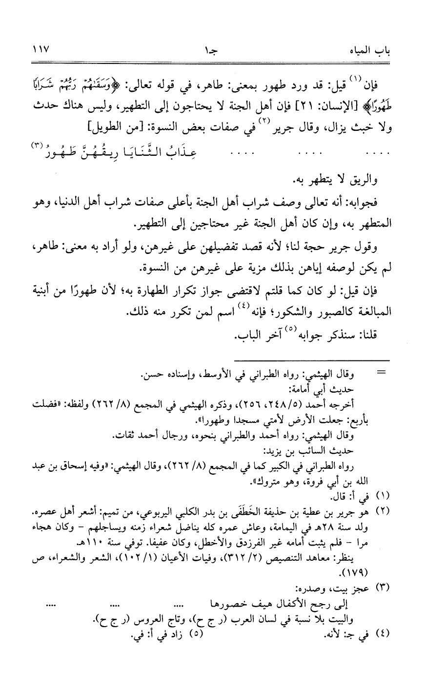 وقول جرير حجة لنا, لأنه قصد تفضيلهن على غيرهن, ولو أراد به معنى: طاهر, لم يكن لوصفه إياهن بذلك مزية على غيرهن من النسوة.