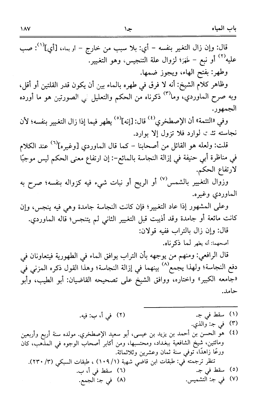 وفي "التتمة" أن الإصطخري قال: [إنه] يطهر فيما إذا زال التغيير بنفسه؛ لأن