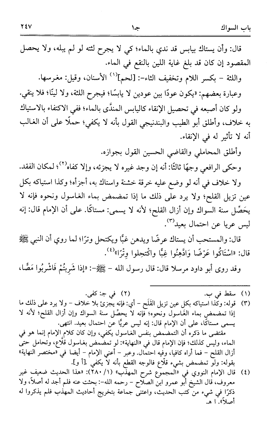 وعبارة بعضهم:"يكون عوداً بين عودين لا يابساً؛ فيجرح اللثة، ولا ليناً؛ فلا ينقي.