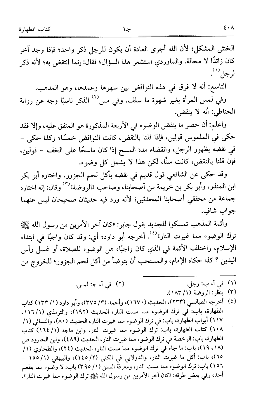 وأئمة المذهب تمسكوا للجديد بقول جابر:"كان آخر الأمرين من رسول الله صلى الله عليه وسلم ترك الوضوء مما غيرت النار".أخرجه أبو داود؛ أي: وقد كان واجبا في ابتداء