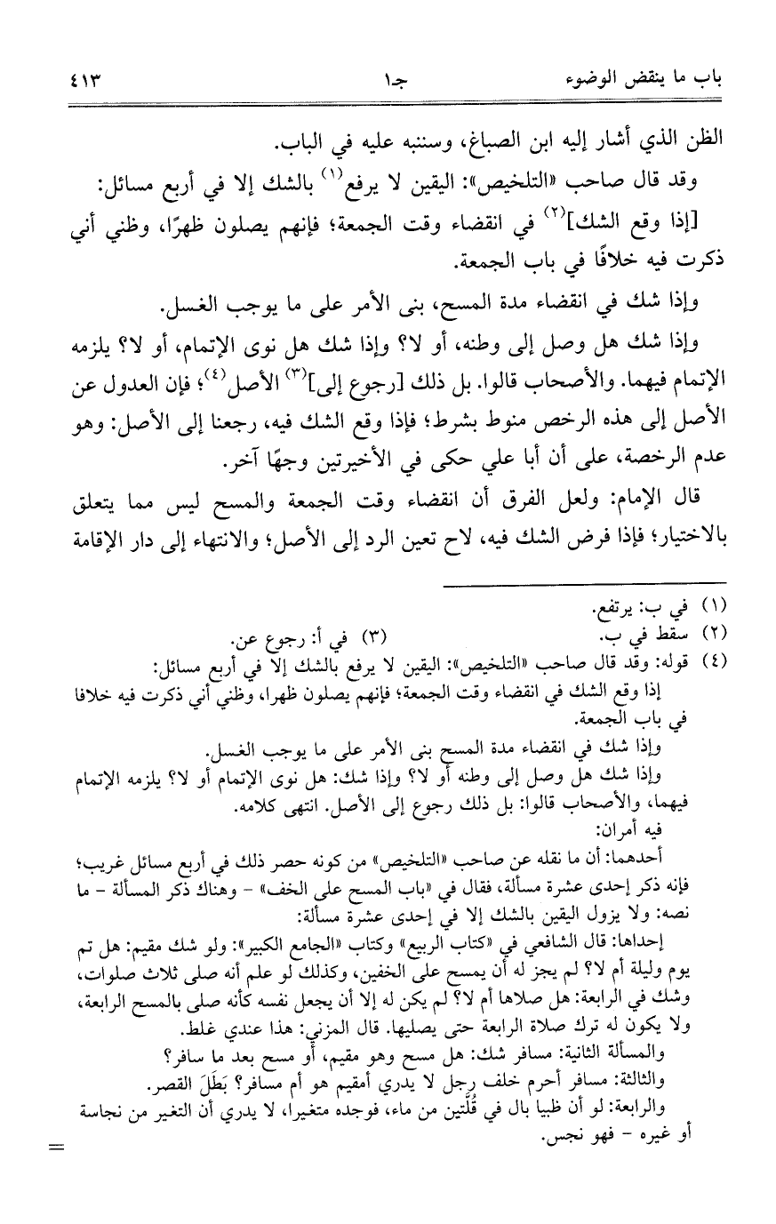 وقد قال صاحب"التلخيص": اليقين لا يرفع بالشك إلا في أربع مسائل: