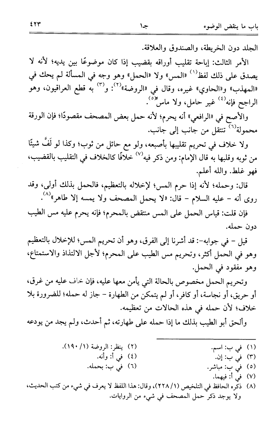 والأصح في"الرافعي"أنه يحرم؛ لأنه حمل بعض المصحف مقصودا؛ فإن الورقة