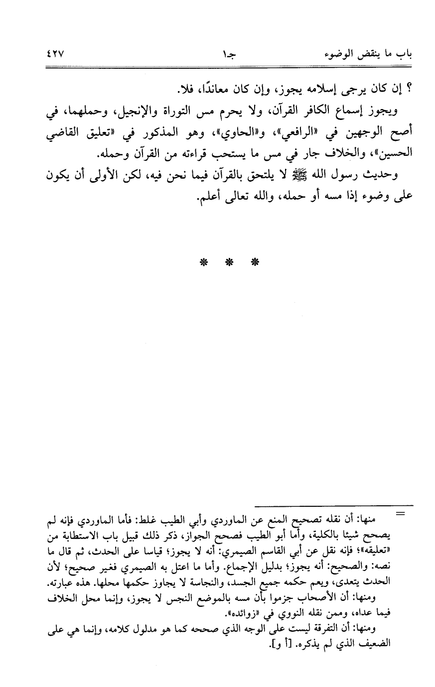 ويجوز إسماع الكافر القرآن، ولا يحرم مس التوراة والإنجيل، وحملهما، في