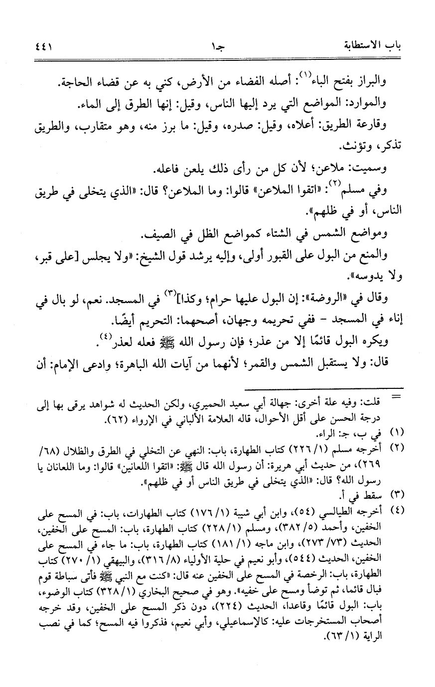 وفي مسلم: "اتقوا الملاعن" قالوا: وما الملاعن؟ قال: "الذي يتخلى في طريق