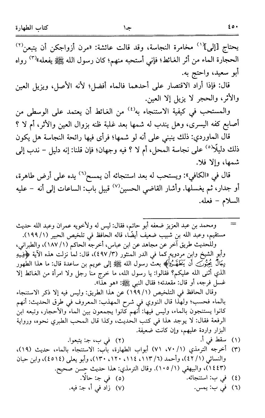 الحجارة الماء من أثر الغائط؛ فإني أستحبه منهم؛ كان رسول الله صلى الله علبيه وسلم يفعله" رواه أبو سعيد، واحتج به.