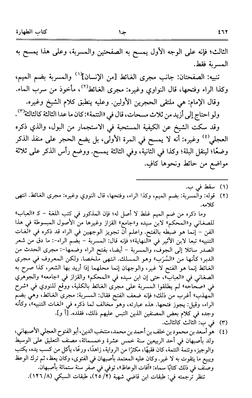 الثالث؛ فإنه على الوجه الأول يمسح به الصفحتين والمسربة, وعلى هذا يمسح به