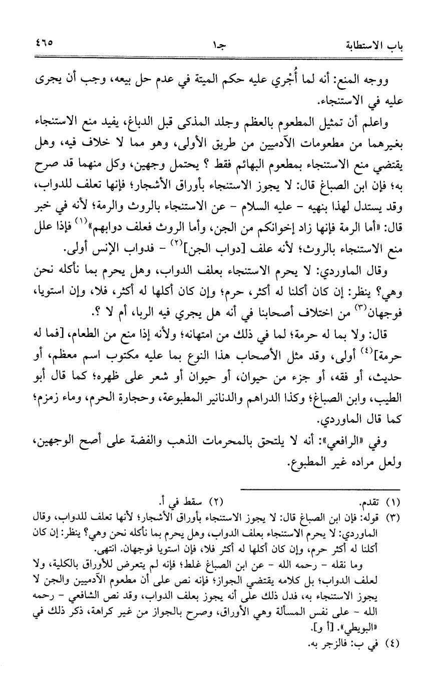 واعلم أن تمثيل المطعوم بالعظم وجلد المذكى قبل الدباغ، يفيد منع الاستنجاء