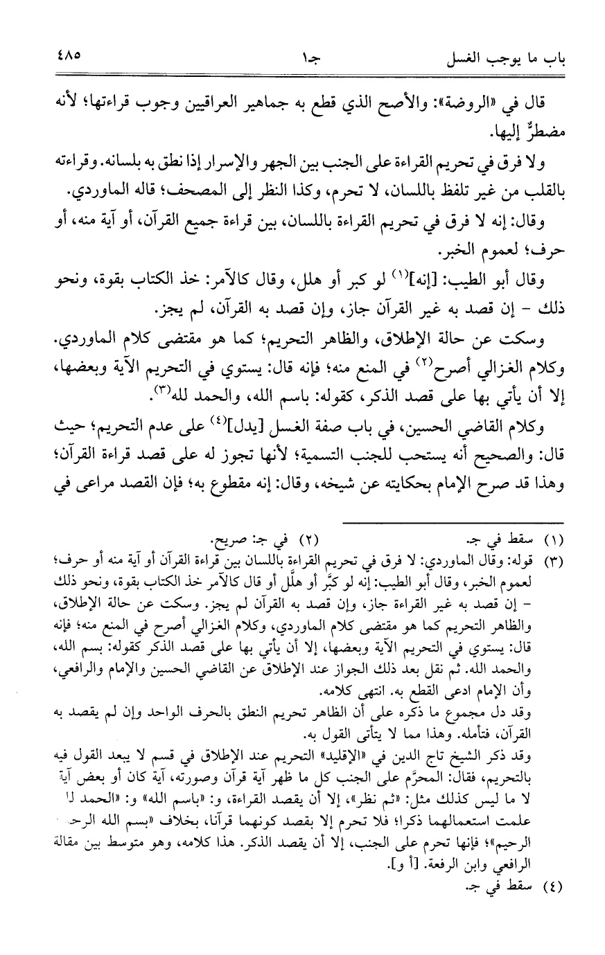 وقال: إنه لا فرق في تحريم القراءة باللسان، بين قراءة جميع القرآن، أو آية منه، أو