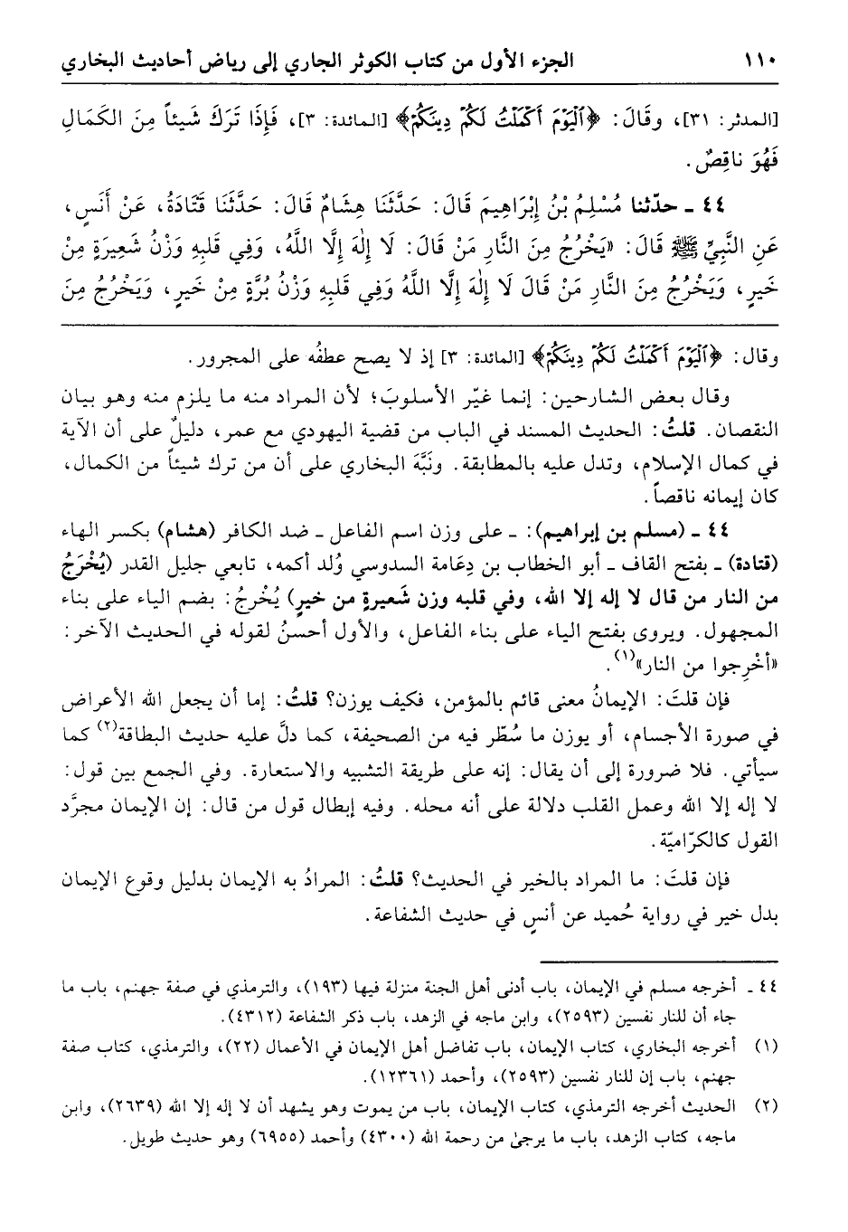 44 - (مسلم بن إبراهيم): -على وزن اسم الفاعل- ضد الكافر (هشام) بكسر الهاء (قتادة) -بفتح القاف- أبو الخطَّاب بن دِعَامة السدوسي وُلد أكمه، تابعي جليل القدر (يُخْرَجُ من النَّار من قال لا إله إلَّا الله، وفي قلبه وزن شَعيرةٍ من خيرٍ) يُخْرجُ: بضم الياء على بناء المجهول. ويروى بفتح الياء على بناء الفاعل، والأول أحسنُ لقوله في الحديث الآخر: "أخْرِجوا من النَّار".