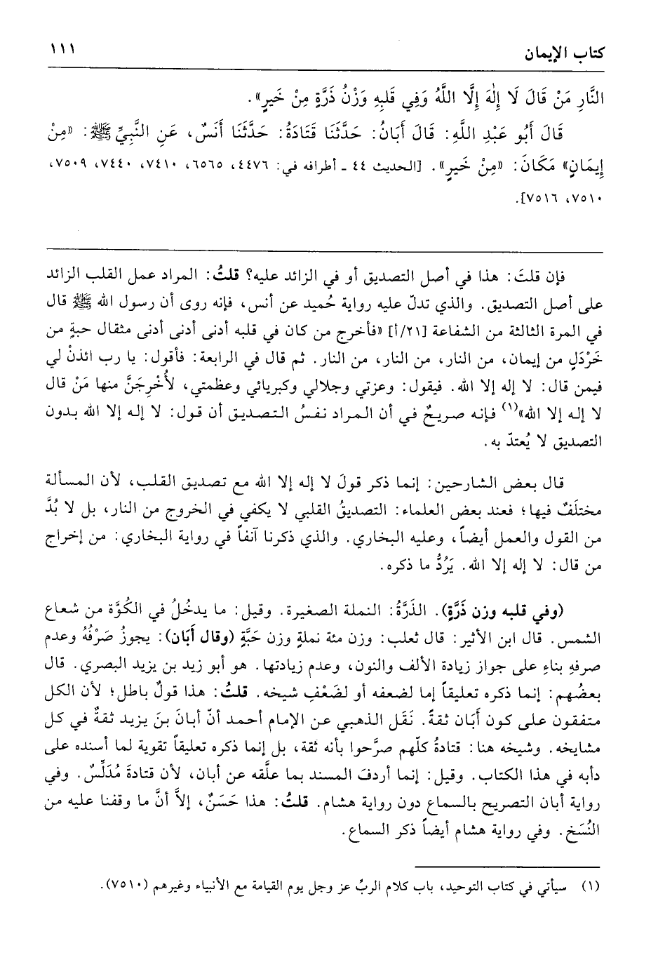 النَّارِ مَنْ قَالَ لاَ إِلَهَ إِلَّا اللَّهُ، وَفِي قَلْبِهِ وَزْنُ ذَرَّةٍ مِنْ خَيْرٍ» قَالَ أَبُو عَبْدِ اللَّهِ: قَالَ أَبَانُ، حَدَّثَنَا قَتَادَةُ، حَدَّثَنَا أَنَسٌ، عَنِ النَّبِيِّ صَلَّى اللهُ عَلَيْهِ وَسَلَّمَ: «مِنْ إِيمَانٍ» مَكَانَ «مِنْ خَيْرٍ». [الحديث 44 - أطرافه في: 4476 - أطرافه في: 4476 - 6565 - 7410 - 7440 - 7509 - 7510 - 7516]