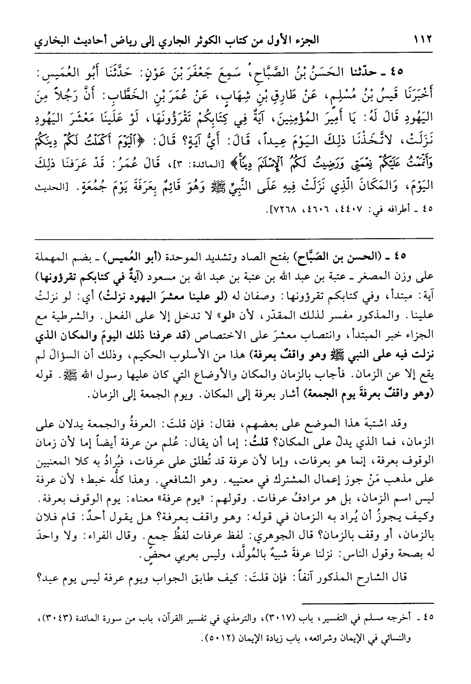 45 - (الحسن بن الصَبَّاح) بفتح الصاد وتشديد الموحدة (أبو العُميس) -بضم المهملة على وزن المصغر- عتبة بن عبد الله بن عتبة بن عبد الله بن مسعود (آية في كتابكم تقرؤونها) آية: مبتدأ، وفي كتابكم تقرؤونها: وصفان له (لو علينا معشرَ اليهود نزلتْ) أي: لو نزلتْ علينا. والمذكور مفسر لذلك المقدّر، لأنَّ "لو" لا تدخل إلَّا على الفعل. والشرطية مع الجزاء خبر المبتدأ، وانتصاب معشرَ على الاختصاص (قد عرفنا ذلك اليومَ والمكان الذي نزلت فيه على النَّبيِّ - صلى الله عليه وسلم - وهو واقفٌ بعرفة) هذا من الأسلوب الحكيم، وذلك أن السؤالَ لم يقع إلَّا عن الزمان. فأجاب بالزمان والمكان والأوضاع التي كان عليها رسول الله - صَلَّى الله عليه وسلم -. قوله (وهو واقفٌ بعرفةَ يوم الجمعة) أشار بعرفة إلى المكان. ويوم الجمعة إلى الزمان.