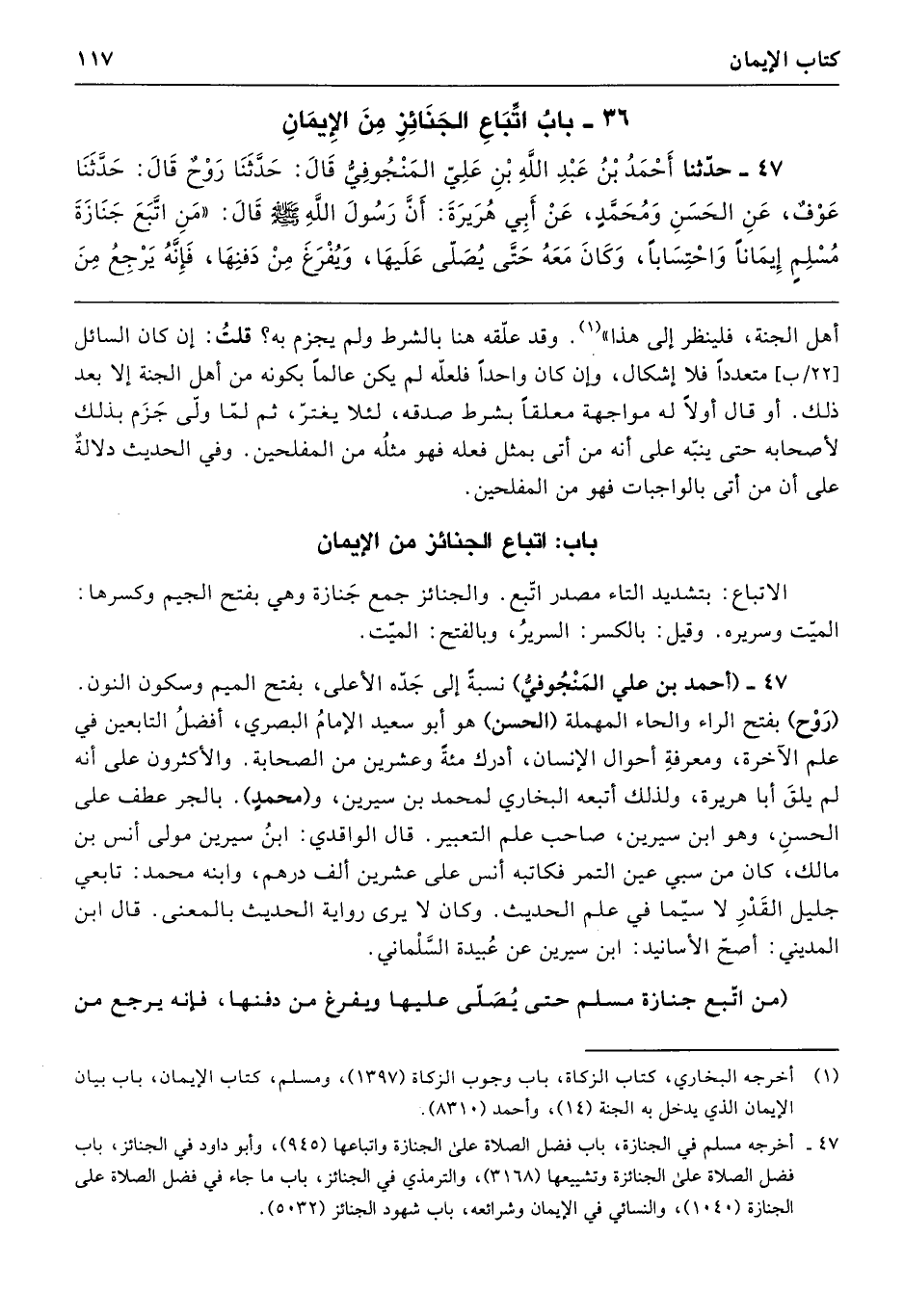 47 - حَدَّثَنَا أَحْمَدُ بْنُ عَبْدِ اللَّهِ بْنِ عَلِيٍّ المَنْجُوفِيُّ، قَالَ: حَدَّثَنَا رَوْحٌ، قَالَ: حَدَّثَنَا عَوْفٌ، عَنِ الحَسَنِ، وَمُحَمَّدٍ، عَنْ أَبِي هُرَيْرَةَ أَنَّ رَسُولَ اللَّهِ صَلَّى اللهُ عَلَيْهِ وَسَلَّمَ قَالَ: «مَنِ اتَّبَعَ جَنَازَةَ مُسْلِمٍ، إِيمَانًا وَاحْتِسَابًا، وَكَانَ مَعَهُ حَتَّى يُصَلَّى عَلَيْهَا وَيَفْرُغَ مِنْ دَفْنِهَا، فَإِنَّهُ يَرْجِعُ مِنَ