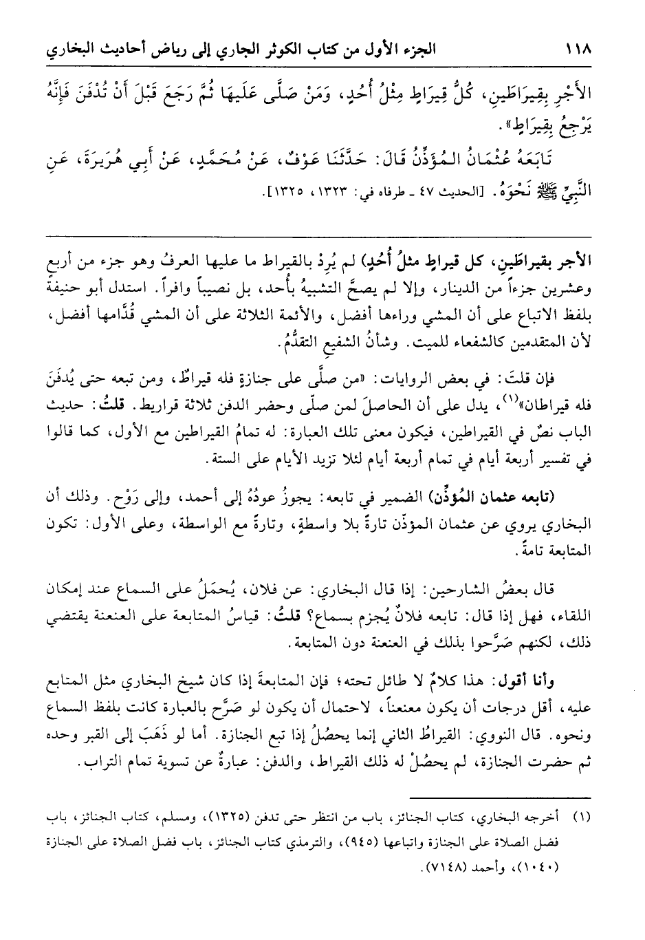 الأَجْرِ بِقِيرَاطَيْنِ، كُلُّ قِيرَاطٍ مِثْلُ أُحُدٍ، وَمَنْ صَلَّى عَلَيْهَا ثُمَّ رَجَعَ قَبْلَ أَنْ تُدْفَنَ، فَإِنَّهُ يَرْجِعُ بِقِيرَاطٍ» تَابَعَهُ عُثْمَانُ المُؤَذِّنُ، قَالَ: حَدَّثَنَا عَوْفٌ، عَنْ مُحَمَّدٍ، عَنْ أَبِي هُرَيْرَةَ، عَنِ النَّبِيِّ صَلَّى اللهُ عَلَيْهِ وَسَلَّمَ نَحْوَهُ. [الحديث 47 - طرفاه في: 1323 - 1325]