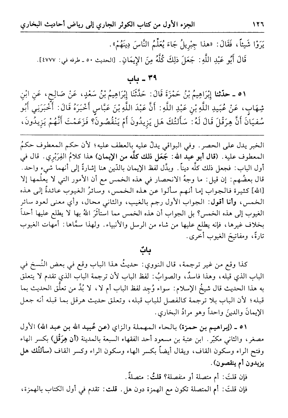 51 - (إبراهيم بن حمزة) بالحاء المهملة والزاي (عن عُبيد الله بن عيد الله) الأول مصغر، والثاني مكبّر. ابن عتبة بن مسعود أحد الفقهاء السبعة بالمدينة (أن هِرَقْل) بكسر الهاء وفتح الراء وسكون القاف، ويقال أيضًا بكسر الهاء وسكون الراء وكسر القاف (سألتُك هل يزيدون أم ينقصون).