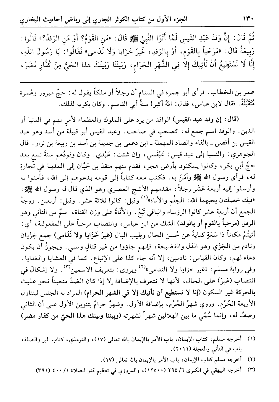 ثُمَّ قَالَ: إِنَّ وَفْدَ عَبْدِ القَيْسِ لَمَّا أَتَوُا النَّبِيَّ صَلَّى اللهُ عَلَيْهِ وَسَلَّمَ قَالَ: «مَنِ القَوْمُ؟ - أَوْ مَنِ الوَفْدُ؟ -» قَالُوا: رَبِيعَةُ. قَالَ: «مَرْحَبًا بِالقَوْمِ، أَوْ بِالوَفْدِ، غَيْرَ خَزَايَا وَلاَ نَدَامَى»، فَقَالُوا: يَا رَسُولَ اللَّهِ إِنَّا لاَ نَسْتَطِيعُ أَنْ نَأْتِيكَ إِلَّا فِي الشَّهْرِ الحَرَامِ، وَبَيْنَنَا وَبَيْنَكَ هَذَا الحَيُّ مِنْ كُفَّارِ مُضَرَ،