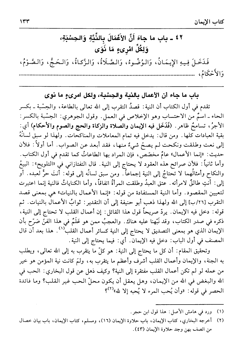 وتحقيق المقام: أن كل ما يحتاج إلى النيَّة: هو كل ما يتقرب به إلى الله تعالى، ويطلب به الجنَّة، والإيمان وأعمال القلب أشرف وأعظم ما يتقرب به، ولمَ كانت نيَّة المؤمن هو خير من عمله لو لم تكن أعمال القلب مفتقرة إلى النيَّة؟ وكيف ذهل عن قول البُخاريّ: الحب في الله والبغض في الله من الإيمان، وهل يعقل أن يكون محل الحب غير القلب؟ وما فائدة الحصر في قوله: "وأن يُحب المرء لا يُحبه إلا لله"؟