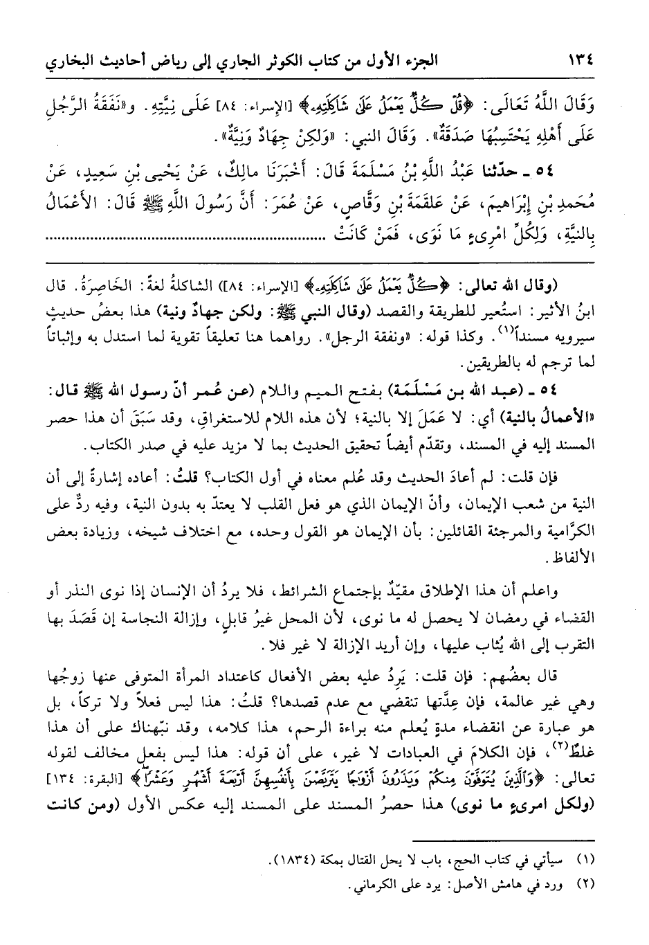 "وقال الله تعالى: ({كُلٌّ يَعْمَلُ عَلَى شَاكِلَتِهِ} [الإسراء: 84]) الشاكلةُ لغةً: الخَاصِرَةُ. قال ابنُ الأثير: استُعير للطريقة والقصد (وقال النَّبيُّ - صلى الله عليه وسلم -: ولكن جهاد ونية) هذا بعضُ حديثٍ سيرويه مسندًا. وكذا قوله: "ونفقة الرجل". رواهما هنا تعليقًا تقوية لما استدل به وإثباتًا لما ترجم له بالطريقين.