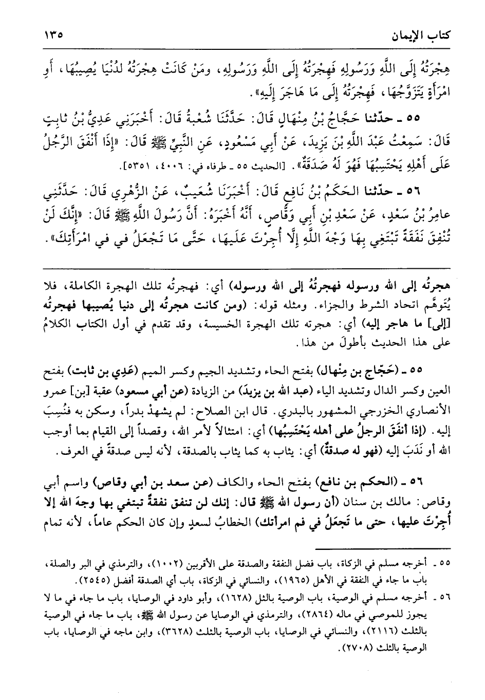 55 - (حَجّاج بن مِنْهال) بفتح الحاء وتشديد الجيم وكسر الميم (عَدِي بن ثابت) بفتح العين وكسر الدال وتشديد الياء (عبد الله بن يزيدَ) من الزيادة (عن أبي مسعود) عقبة [بن] عمرو الأنصاري الخزرجي المشهور بالبدري. قال ابن الصلاح: لم يشهدْ بدرًا، وسكن به فنُسِبَ إليه. (إذا أنفَقَ الرجلُ على أهله يَحْتَسِبُها) أي: امتثالًا لأمر الله، وقصدًا إلى القيام بما أوجب الله أو نَدَبَ إليه (فهو له صدقةٌ) أي: يثاب به كما يثاب بالصدقة؛ لأنَّه ليس صدقةً في العرف.