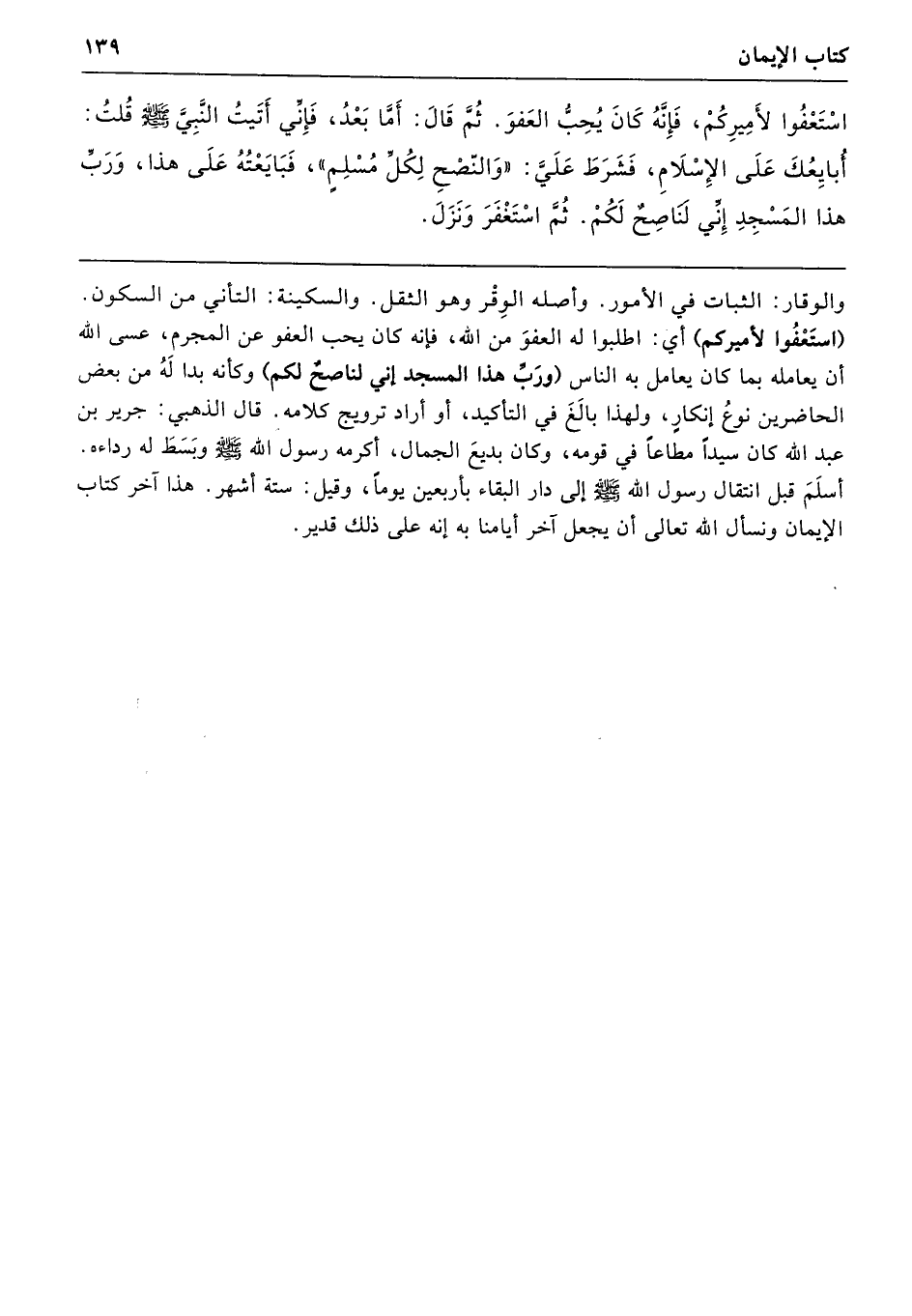 والوقار: الثبات في الأمور. وأصله الوِقْر وهو الثقل. والسكينة: التأني من السكون. (استَعْفوا لأميركم) أي: اطلبوا له العفوَ من الله، فإنَّه كان يحب العفو عن المجرم، عسى الله أن يعامله بما كان يعامل به النَّاس (ورَبِّ هذا المسجد إنِّي لناصحٌ لكم) وكأنه بدا لَهُ من بعض الحاضرين نوعُ إنكارِ، ولهذا بالَغَ في التأكيد، أو أراد ترويج كلامه. قال الذهبي: جرير بن عبد الله كان سيدًا مطاعًا في قومه، وكان بديعَ الجمال، أكرمه رسول الله - صَلَّى الله عليه وسلم - وبَسَطَ له رداءه. أسلَمَ قبل انتقال رسول الله - صلى الله عليه وسلم - إلى دار البقاء بأربعين يومًا، وقيل: ستة أشهر. هذا آخر كتاب الإيمان ونسأل الله تعالى أن يجعل آخر أيامنا به إنه على ذلك قدير.