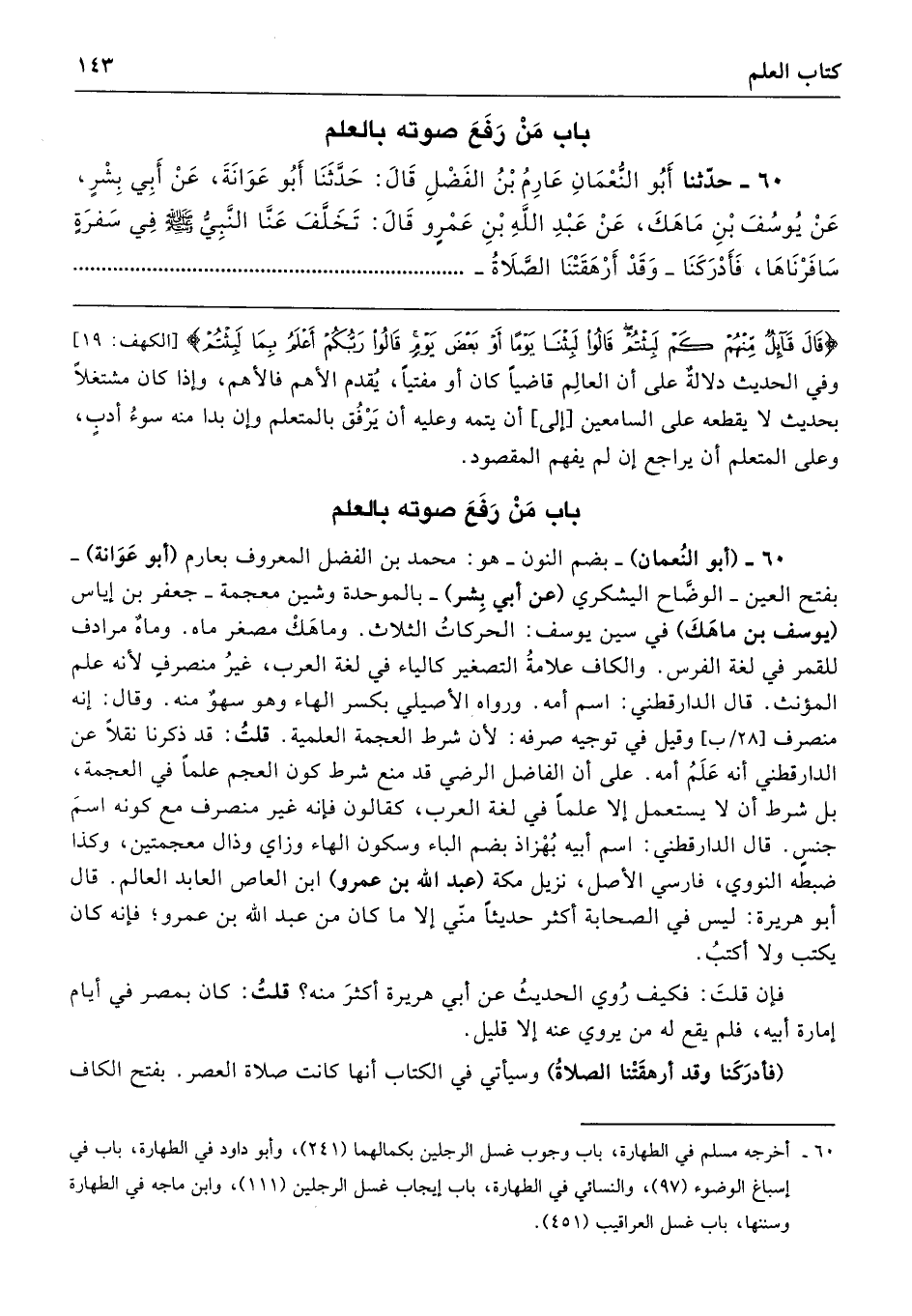 60 - حَدَّثَنَا أَبُو النُّعْمَانِ عَارِمُ بْنُ الفَضْلِ، قَالَ: حَدَّثَنَا أَبُو عَوَانَةَ، عَنْ أَبِي بِشْرٍ، عَنْ يُوسُفَ بْنِ مَاهَكَ، عَنْ عَبْدِ اللَّهِ بْنِ عَمْرٍو، قَالَ: تَخَلَّفَ عَنَّا النَّبِيُّ صَلَّى اللهُ عَلَيْهِ وَسَلَّمَ فِي سَفْرَةٍ سَافَرْنَاهَا فَأَدْرَكَنَا - وَقَدْ أَرْهَقَتْنَا الصَّلاَةُ -