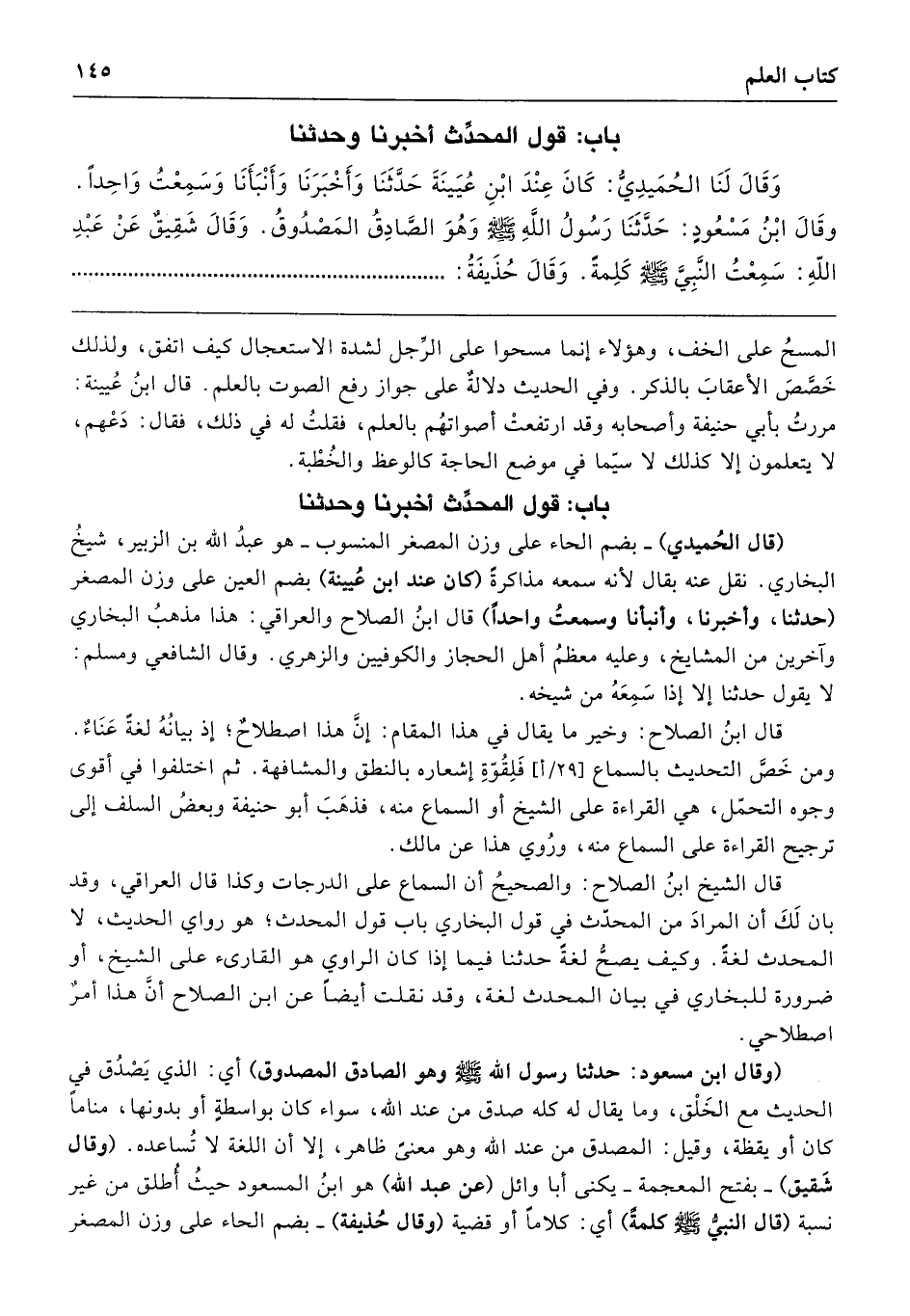 قال الشَّيخ ابنُ الصلاح: والصحيحُ أن السماع على الدرجات وكذا قال العراقي، وقد بان لَكَ أن المرادَ من المحدّث في قول البُخاريّ باب قول المحدث؛ هو رواي الحديث، لا المحدث لغةً. وكيف يصحُّ لغةً حدّثنا فيما إذا كان الراوي هو القارئ على الشَّيخ، أو ضرورة للبخاري في بيان المحدث لغة، وفد نقلت أيضًا عن ابن الصلاح أنَّ هذا أمرٌ اصطلاحي.