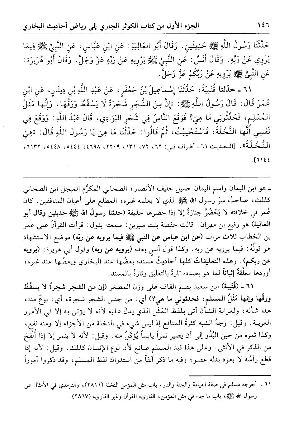 61 - حَدَّثَنَا قُتَيْبَةُ بْنُ سَعِيدٍ، حَدَّثَنَا إِسْمَاعِيلُ بْنُ جَعْفَرٍ، عَنْ عَبْدِ اللَّهِ بْنِ دِينَارٍ، عَنِ ابْنِ عُمَرَ، قَالَ: قَالَ رَسُولُ اللَّهِ صَلَّى اللهُ عَلَيْهِ وَسَلَّمَ: «إِنَّ مِنَ الشَّجَرِ شَجَرَةً لاَ يَسْقُطُ وَرَقُهَا، وَإِنَّهَا مَثَلُ المُسْلِمِ، فَحَدِّثُونِي مَا هِيَ» فَوَقَعَ النَّاسُ فِي شَجَرِ البَوَادِي قَالَ عَبْدُ اللَّهِ: وَوَقَعَ فِي نَفْسِي أَنَّهَا النَّخْلَةُ، فَاسْتَحْيَيْتُ، ثُمَّ قَالُوا: حَدِّثْنَا مَا هِيَ يَا رَسُولَ اللَّهِ قَالَ: «هِيَ النَّخْلَةُ». [الحديث 61 - أطرافه في: 62 - 72 - 131 - 2209 - 4698 - 5444 - 6132 - 6144]